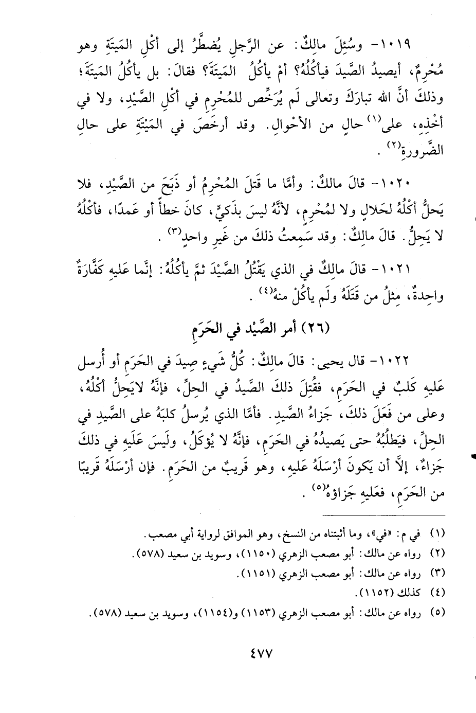 1020- قَالَ مَالِكٌ: وَأَمَّا مَا قَتَلَ الْمُحْرِمُ، أَوْ ذَبَحَ مِنَ الصَّيْدِ، فَلاَ يَحِلُّ أَكْلُهُ لِحَلاَلٍ وَلاَ لِمُحْرِمٍ، لأَنَّهُ لَيْسَ بِذَكِيٍّ، كَانَ خَطَأً أَوْ عَمْدًا، فَأَكْلُهُ لاَ يَحِلُّ، قَالَ مَالِكٌ: وَقَدْ سَمِعْتُ ذَلِكَ مِنْ غَيْرِ وَاحِدٍ.