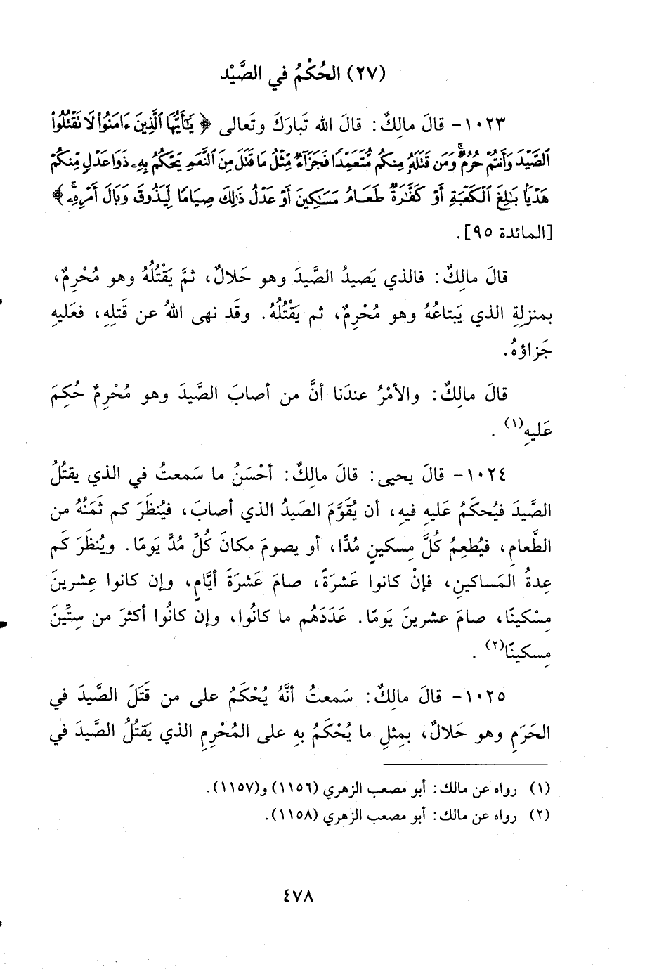 1023- قَالَ مَالِكٌ: قَالَ اللهُ تَبَارَكَ وَتَعَالَى: {يَا أَيُّهَا الَّذِينَ آمَنُوا لاَ تَقْتُلُوا الصَّيْدَ وَأَنْتُمْ حُرُمٌ وَمَنْ قَتَلَهُ مِنْكُمْ مُتَعَمِّدًا فَجَزَاءُ مِثْلِ مَا قَتَلَ مِنَ النَّعَمِ يَحْكُمُ بِهِ ذَوَا عَدْلٍ مِنْكُمْ هَدْيًا بَالِغَ الْكَعْبَةِ أَوْ كَفَّارَةٌ طَعَامُ مَسَاكِينَ أَوْ عَدْلُ ذَلِكَ صِيَامًا لِيَذُوقَ وَبَالَ أَمْرِهِ}.