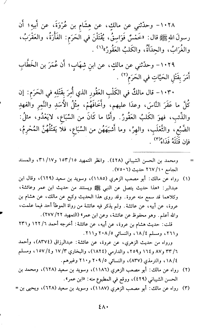 1030- قَالَ مَالِكٌ: فِي الْكَلْبِ الْعَقُورِ الَّذِي أُمِرَ بِقَتْلِهِ فِي الْحَرَمِ، إِنَّ كُلَّ مَا عَقَرَ النَّاسَ وَعَدَا عَلَيْهِمْ، وَأَخَافَهُمْ، مِثْلُ: الأَسَدِ، وَالنَّمِرِ، وَالْفَهْدِ، وَالذِّئْبِ، فَهُوَ الْكَلْبُ الْعَقُورُ، وَأَمَّا مَا كَانَ مِنَ السِّبَاعِ، لاَ يَعْدُو، مِثْلُ: الضَّبُعِ، وَالثَّعْلَبِ وَالْهِرِّ، وَمَا أَشْبَهَهُنَّ مِنَ السِّبَاعِ، فَلاَ يَقْتُلُهُنَّ الْمُحْرِمُ، فَإِنْ قَتَلَهُ، فَدَاهُ.