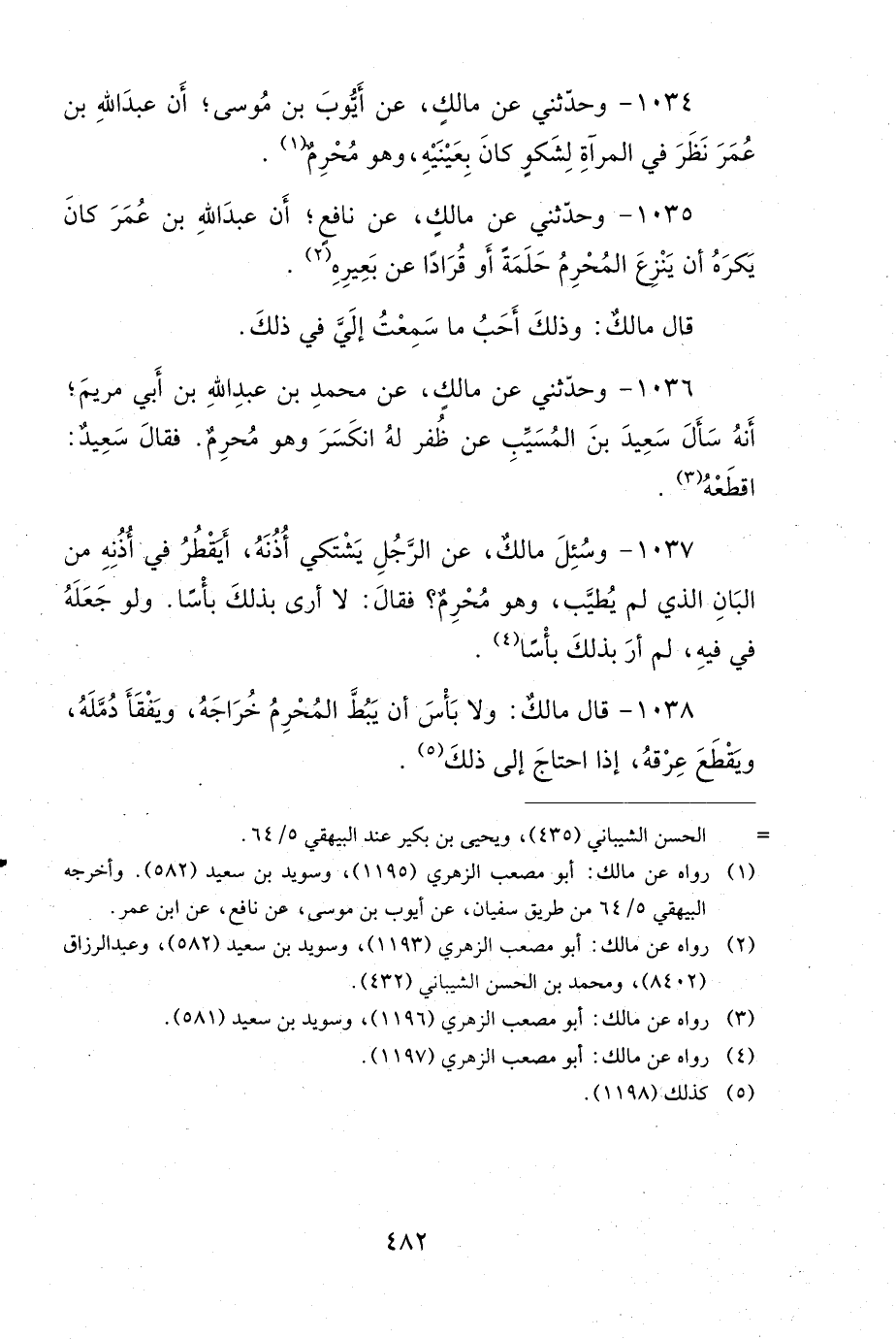 1035- وَحَدَّثَنِي عَنْ مَالِكٍ، عَنْ نَافِعٍ، أَنَّ عَبْدَ اللهِ بْنَ عُمَرَ كَانَ يَكْرَهُ أَنْ يَنْزِعَ الْمُحْرِمُ حَلَمَةً أَوْ قُرَادًا عَنْ بَعِيرِهِ.