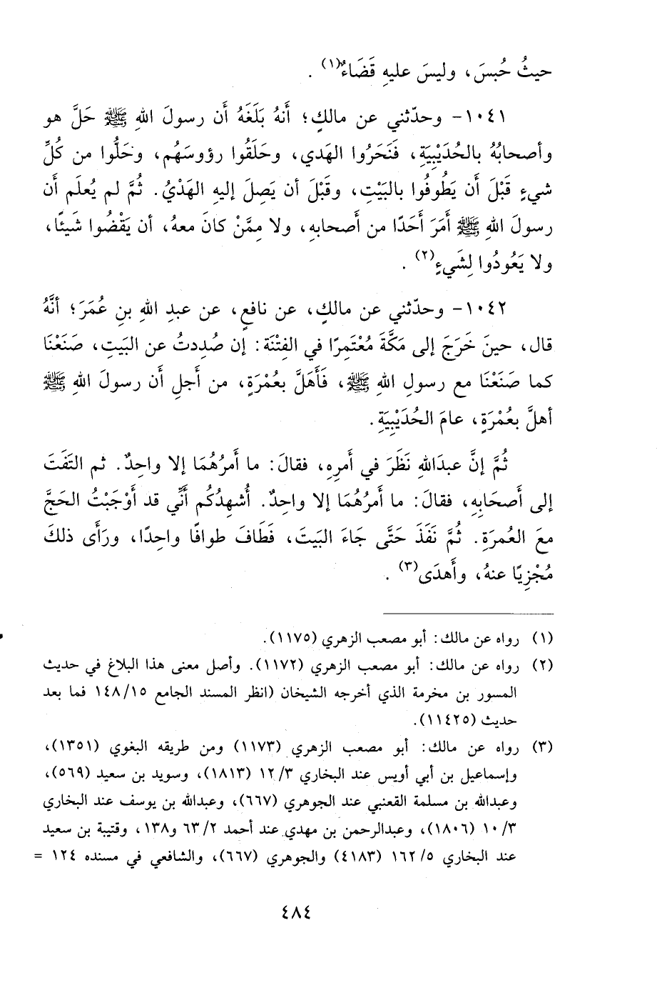 1041- وَحَدَّثَنِي عَنْ مَالِكٍ؛ أَنَّهُ بَلَغَهُ، أَنَّ رَسُولَ اللهِ صَلى الله عَلَيهِ وَسَلمَ حَلَّ هُوَ وَأَصْحَابُهُ بِالْحُدَيْبِيَةِ، فَنَحَرُوا الْهَدْيَ، وَحَلَقُوا رُؤُوسَهُمْ، وَحَلُّوا مِنْ كُلِّ شَيْءٍ قَبْلَ أَنْ يَطُوفُوا بِالْبَيْتِ، وَقَبْلَ أَنْ يَصِلَ إِلَيْهِ الْهَدْيُ، ثُمَّ لَمْ يُعْلَمْ أَنَّ رَسُولَ اللهِ صَلى الله عَلَيهِ وَسَلمَ أَمَرَ أَحَدًا مِنْ أَصْحَابِهِ، وَلاَ مِمَّنْ كَانَ مَعَهُ، أَنْ يَقْضُوا شَيْئًا، وَلاَ يَعُودُوا لِشَيْءٍ.