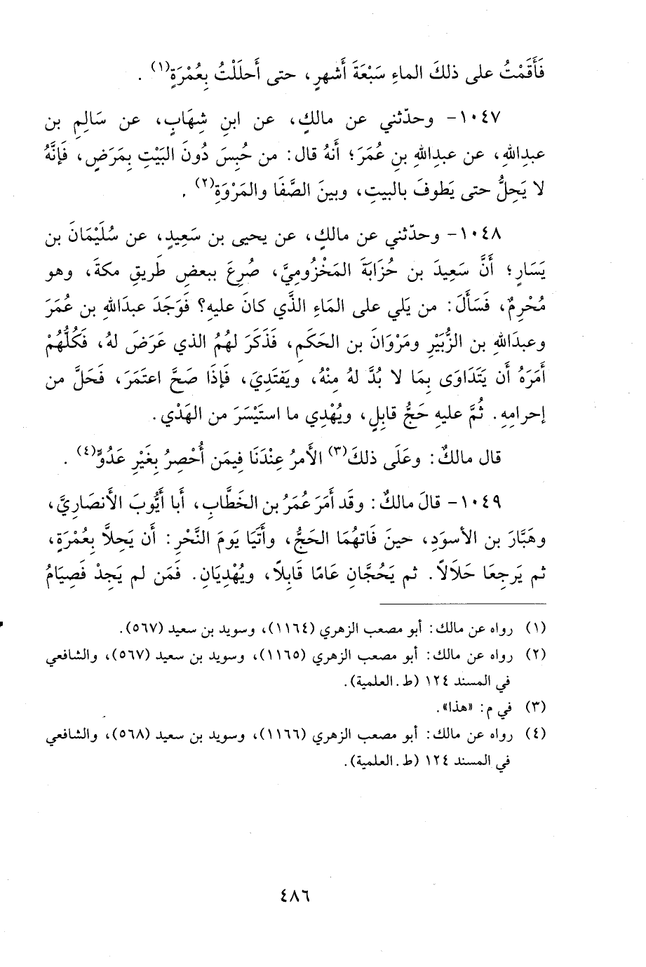 1047- وَحَدَّثَنِي عَنْ مَالِكٍ، عَنِ ابْنِ شِهَابٍ، عَنْ سَالِمِ بْنِ عَبْدِ اللهِ، عَنْ عَبْدِ اللهِ بْنِ عُمَرَ؛ أَنَّهُ قَالَ: مَنْ حُبِسَ دُونَ الْبَيْتِ بِمَرَضٍ، فَإِنَّهُ لاَ يَحِلُّ حَتَّى يَطُوفَ بِالْبَيْتِ، وَبَيْنَ الصَّفَا وَالْمَرْوَةِ.