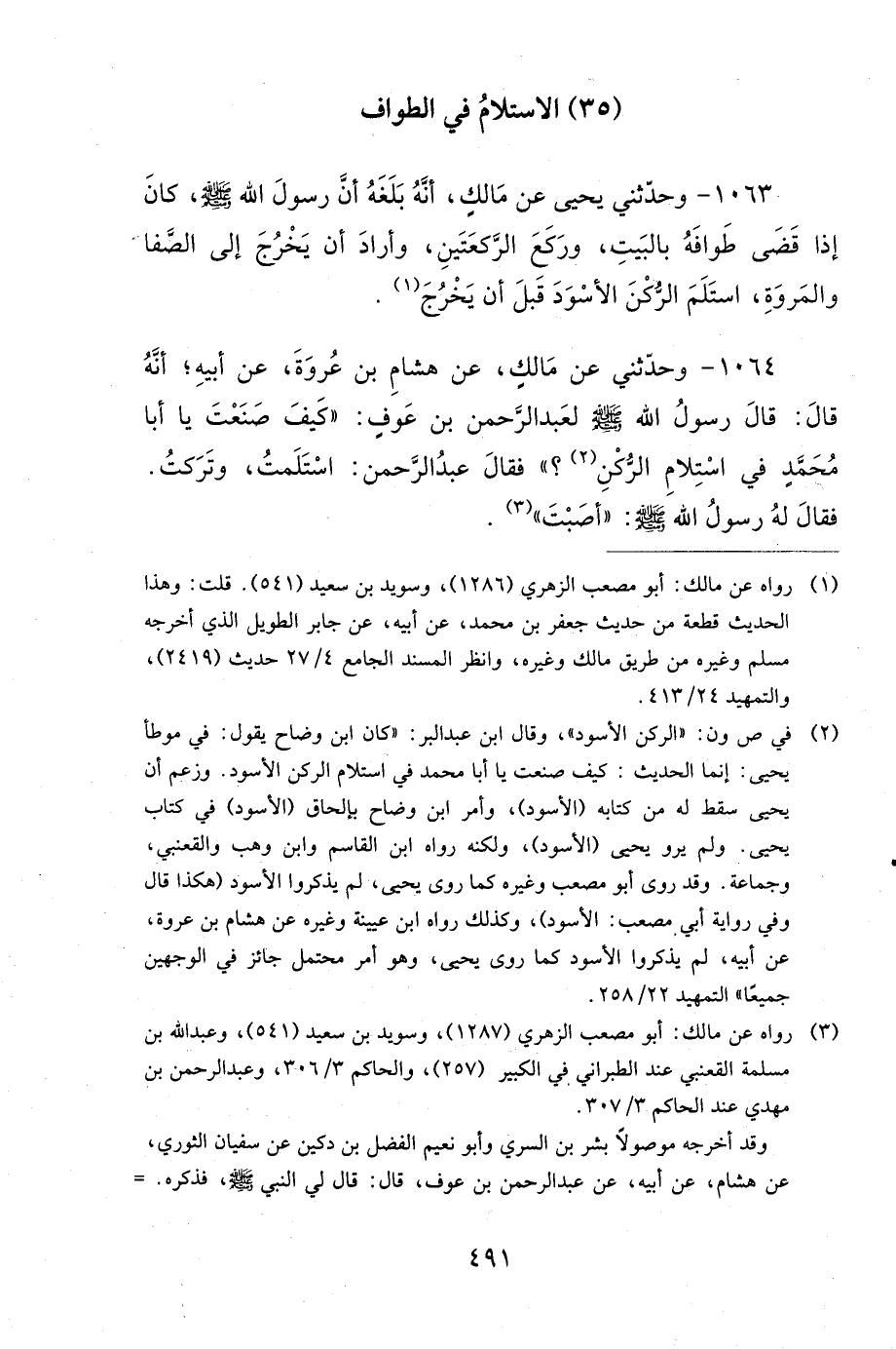 1064- وَحَدَّثَنِي عَنْ مَالِكٍ، عَنْ هِشَامِ بْنِ عُرْوَةَ، عَنْ أَبِيهِ، أَنَّهُ قَالَ: قَالَ رَسُولُ اللهِ صَلى الله عَلَيهِ وَسَلمَ لِعَبْدِ الرَّحْمَنِ بْنِ عَوْفٍ: كَيْفَ صَنَعْتَ يَا أَبَا مُحَمَّدٍ فِي اسْتِلاَمِ الرُّكْنِ؟ فَقَالَ عَبْدُ الرَّحْمَنِ: اسْتَلَمْتُ وَتَرَكْتُ، فَقَالَ لَهُ رَسُولُ اللهِ صَلى الله عَلَيهِ وَسَلمَ: أَصَبْتَ.