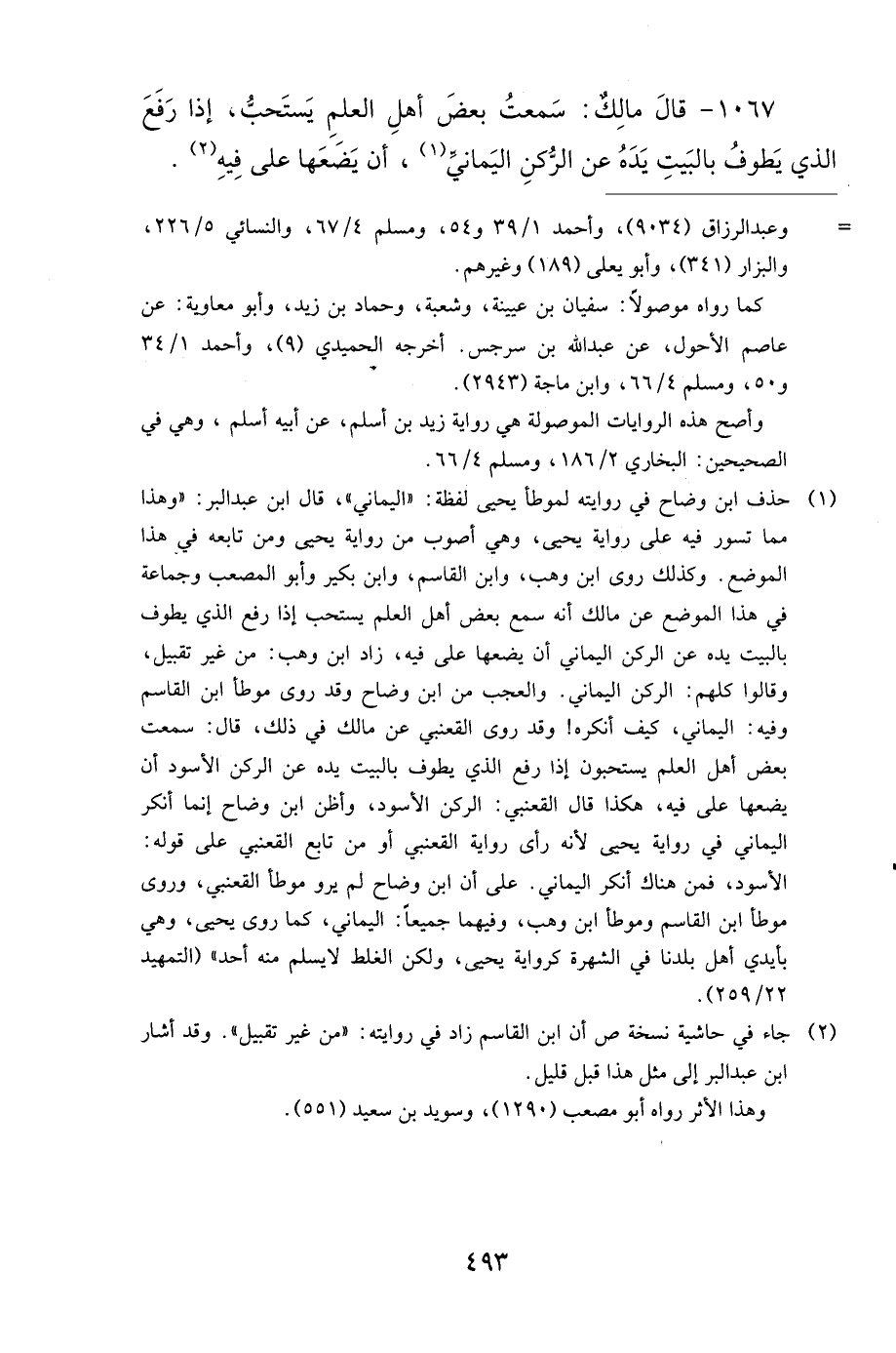 1067- قَالَ مَالِكٌ: سَمِعْتُ بَعْضَ أَهْلِ الْعِلْمِ يَسْتَحِبُّ إِذَا رَفَعَ الَّذِي يَطُوفُ بِالْبَيْتِ يَدَهُ عَنِ الرُّكْنِ الْيَمَانِي، أَنْ يَضَعَهَا عَلَى فِيهِ.