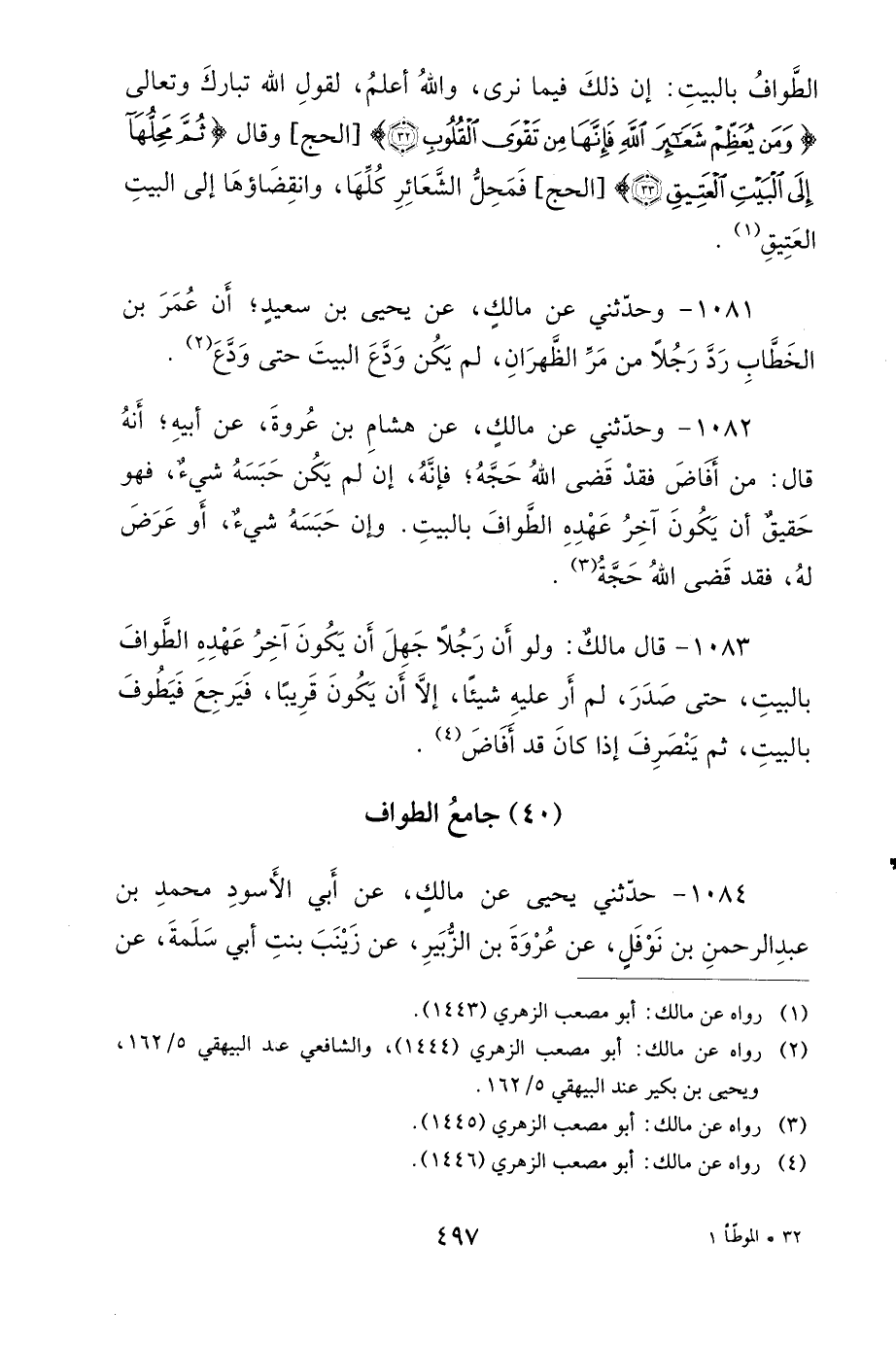 1080- قَالَ مَالِكٌ: فِي قَوْلِ عُمَرَ بْنِ الْخَطَّابِ: فَإِنَّ آخِرَ النُّسُكِ الطَّوَافُ بِالْبَيْتِ، إِنَّ ذَلِكَ فِيمَا نُرَى، وَاللهُ أَعْلَمُ، لِقَوْلِ اللهِ تَبَارَكَ وَتَعَالَى: {وَمَنْ يُعَظِّمْ شَعَائِرَ اللهِ فَإِنَّهَا مِنْ تَقْوَى الْقُلُوبِ} وَقَالَ: {ثُمَّ مَحِلُّهَا إِلَى الْبَيْتِ الْعَتِيقِ} فَمَحِلُّ الشَّعَائِرِ كُلِّهَا، وَانْقِضَاؤُهَا إِلَى الْبَيْتِ الْعَتِيقِ.