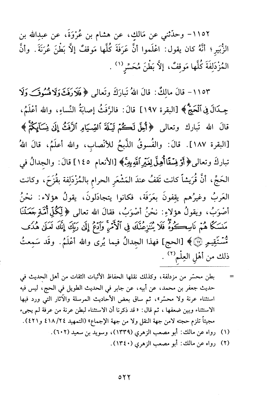 1153- قَالَ مَالِكٌ: قَالَ اللهُ تَبَارَكَ وَتَعَالَى: {فَلاَ رَفَثَ وَلاَ فُسُوقَ وَلاَ جِدَالَ فِي الْحَجِّ} قَالَ: فَالرَّفَثُ إِصَابَةُ النِّسَاءِ، وَاللهُ أَعْلَمُ، قَالَ اللهُ تَبَارَكَ وَتَعَالَى: {أُحِلَّ لَكُمْ لَيْلَةَ الصِّيَامِ الرَّفَثُ إِلَى نِسَائِكُمْ} قَالَ: وَالْفُسُوقُ: الذَّبْحُ لِلأَنْصَابِ، وَاللهُ أَعْلَمُ، قَالَ اللهُ تَبَارَكَ وَتَعَالَى: {أَوْ فِسْقًا أُهِلَّ لِغَيْرِ اللهِ بِهِ} قالَ: وَالْجِدَالُ فِي الْحَجِّ، أَنَّ قُرَيْشًا كَانَتْ تَقِفُ عِنْدَ الْمَشْعَرِ الْحَرَامِ بِالْمُزْدَلِفَةِ بِقُزَحَ، وَكَانَتِ الْعَرَبُ وَغَيْرُهُمْ يَقِفُونَ بِعَرَفَةَ، فَكَانُوا يَتَجَادَلُونَ، يَقُولُ هَؤُلاَءِ: نَحْنُ أَصْوَبُ، وَيَقُولُ هَؤُلاَءِ: نَحْنُ أَصْوَبُ، فَقَالَ اللهُ تَعَالَى: {لِكُلِّ أُمَّةٍ جَعَلْنَا مَنْسَكًا هُمْ نَاسِكُوهُ فَلاَ يُنَازِعُنَّكَ فِي الأَمْرِ وَادْعُ إِلَى رَبِّكَ إِنَّكَ لَعَلَى هُدًى مُسْتَقِيمٍ} فَهَذَا الْجِدَالُ فِيمَا يُرَى، وَاللهُ أَعْلَمُ، وَقَدْ سَمِعْتُ ذَلِكَ مِنْ أَهْلِ الْعِلْمِ.