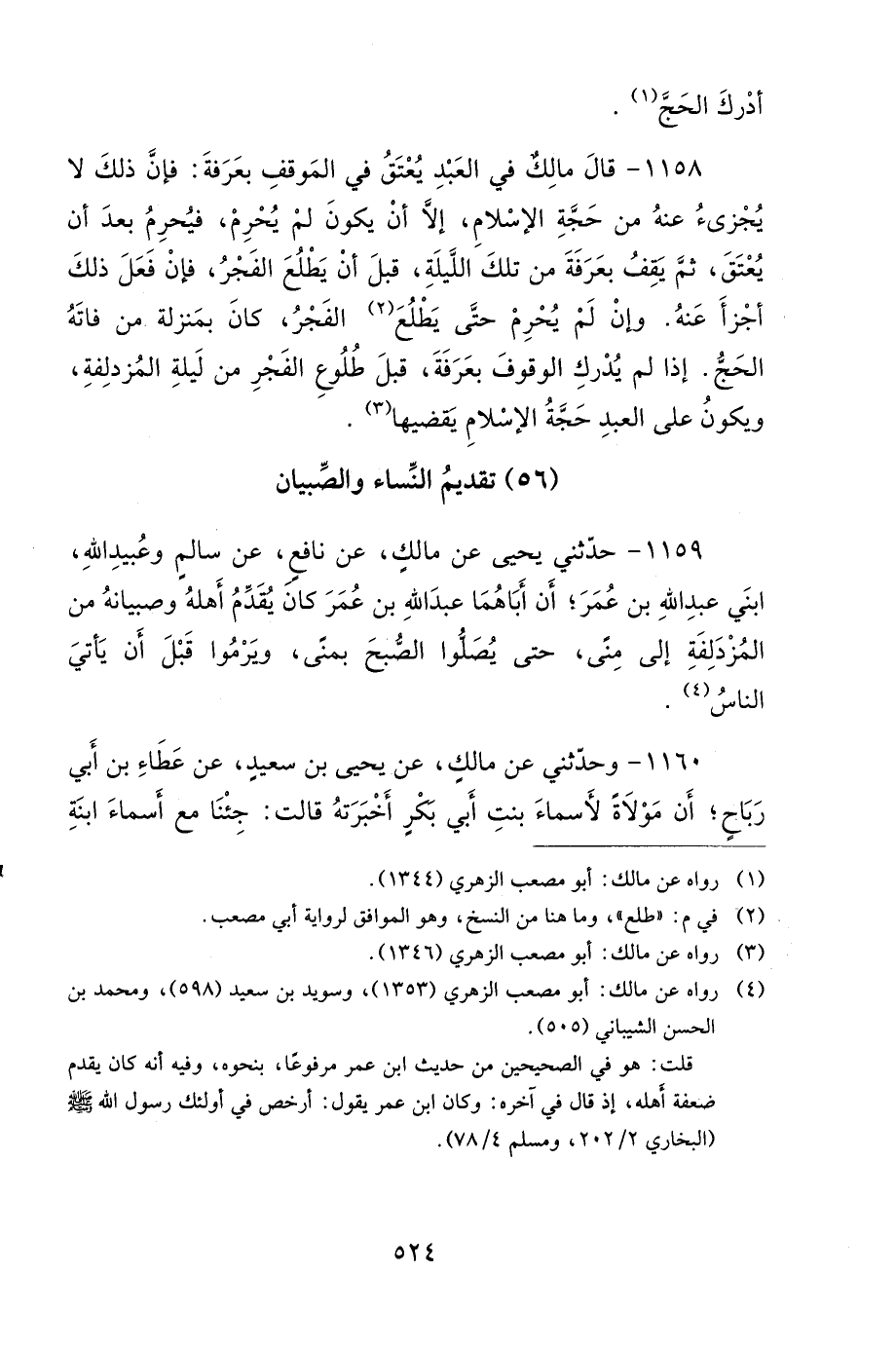1159- حَدَّثَنِي يَحْيَى، عَنْ مَالِكٍ، عَنْ نَافِعٍ، عَنْ سَالِمٍ، وَعُبَيْدِ اللهِ ابْنَيْ عَبْدِ اللهِ بْنِ عُمَرَ؛ أَنَّ أَبَاهُمَا عَبْدَ اللهِ بْنَ عُمَرَ كَانَ يُقَدِّمُ أَهْلَهُ وَصِبْيَانَهُ مِنَ الْمُزْدَلِفَةِ إِلَى مِنًى، حَتَّى يُصَلُّوا الصُّبْحَ بِمِنًى وَيَرْمُوا قَبْلَ أَنْ يَأْتِيَ النَّاسُ.