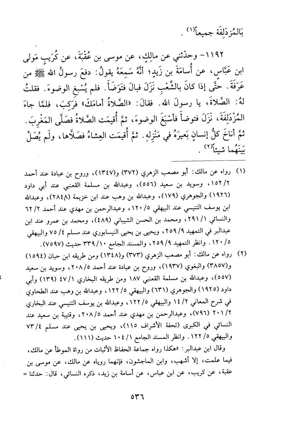 1192- وَحَدَّثَنِي عَنْ مَالِكٍ، عَنْ مُوسَى بْنِ عُقْبَةَ، عَنْ كُرَيْبٍ، مَوْلَى ابْنِ عَبَّاسٍ، عَنْ أُسَامَةَ بْنِ زَيْدٍ، أَنَّهُ سَمِعَهُ يَقُولُ: دَفَعَ رَسُولُ اللهِ صَلى الله عَلَيهِ وَسَلمَ مِنْ عَرَفَةَ، حَتَّى إِذَا كَانَ بِالشِّعْبِ، نَزَلَ فَبَالَ فَتَوَضَّأَ، فَلَمْ يُسْبِغِ الْوُضُوءَ، فَقُلْتُ لَهُ: الصَّلاَةَ يَا رَسُولَ اللهِ، فَقَالَ: الصَّلاَةُ أَمَامَكَ، فَرَكِبَ، فَلَمَّا جَاءَ الْمُزْدَلِفَةَ، نَزَلَ، فَتَوَضَّأَ، فَأَسْبَغَ الْوُضُوءَ، ثُمَّ أُقِيمَتِ الصَّلاَةُ، فَصَلَّى الْمَغْرِبَ، ثُمَّ أَنَاخَ كُلُّ إِنْسَانٍ بَعِيرَهُ فِي مَنْزِلِهِ، ثُمَّ أُقِيمَتِ الْعِشَاءُ فَصَلاَّهَا، وَلَمْ يُصَلِّ بَيْنَهُمَا شَيْئًا.