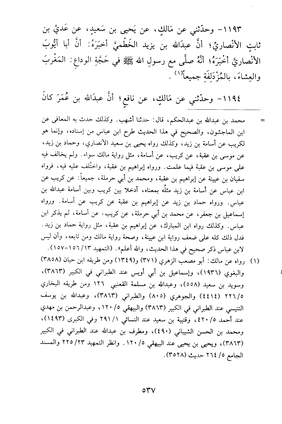 1194- وَحَدَّثَنِي عَنْ مَالِكٍ، عَنْ نَافِعٍ، أَنَّ عَبْدَ اللهِ بْنَ عُمَرَ كَانَ يُصَلِّي الْمَغْرِبَ وَالْعِشَاءَ بِالْمُزْدَلِفَةِ جَمِيعًا.