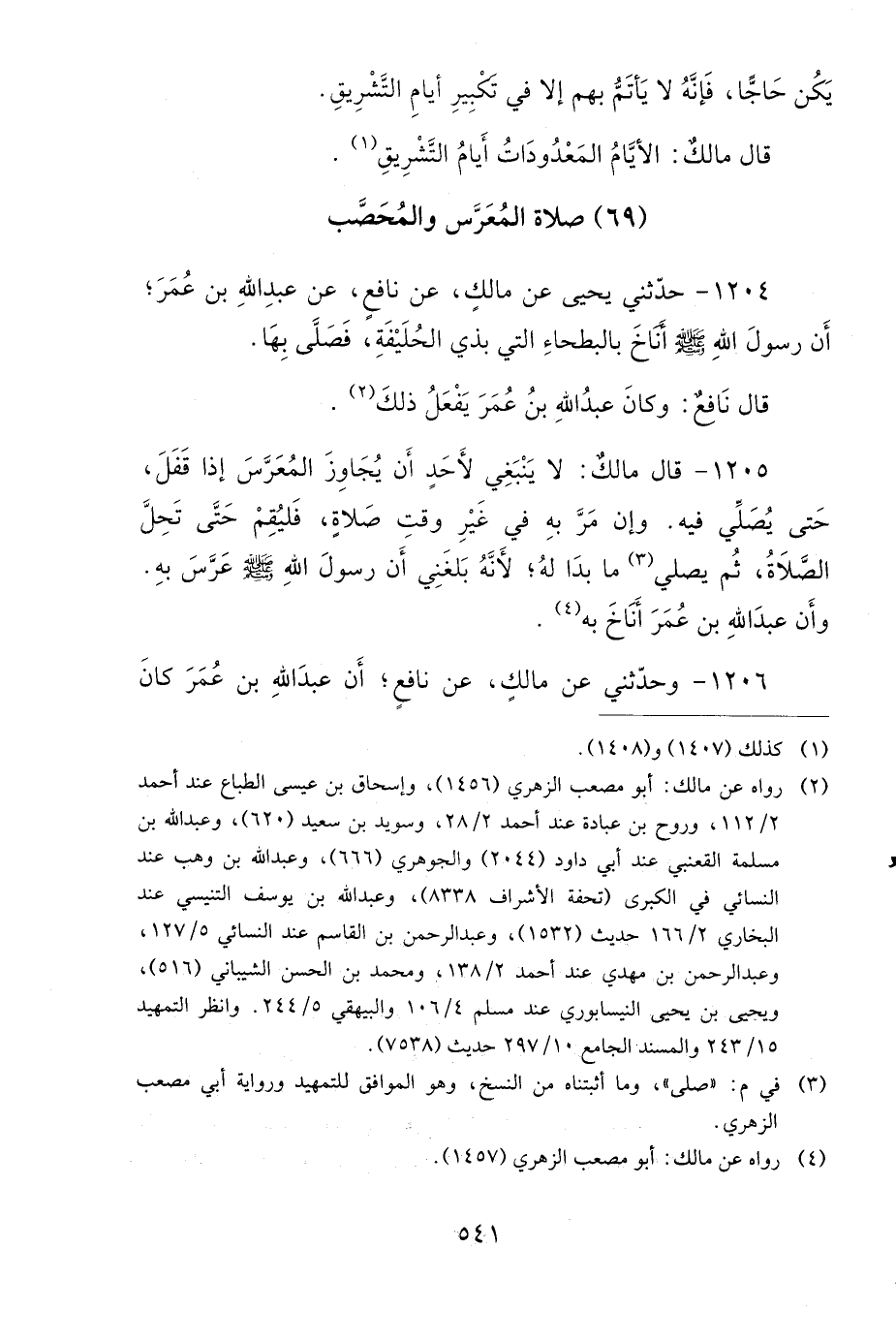 1205- قَالَ مَالِكٌ: لاَ يَنْبَغِي لأَحَدٍ أَنْ يُجَاوِزَ الْمُعَرَّسَ إِذَا قَفَلَ، حَتَّى يُصَلِّيَ فِيهِ، وَإِنْ مَرَّ بِهِ فِي غَيْرِ وَقْتِ صَلاَةٍ، فَلْيُقِمْ حَتَّى تَحِلَّ الصَّلاَةُ، ثُمَّ يُصَلِّي مَا بَدَا لَهُ، لأَنَّهُ بَلَغَنِي، أَنَّ رَسُولَ اللهِ صَلى الله عَلَيهِ وَسَلمَ عَرَّسَ بِهِ، وَأَنَّ عَبْدَ اللهِ بْنَ عُمَرَ أَنَاخَ بِهِ.