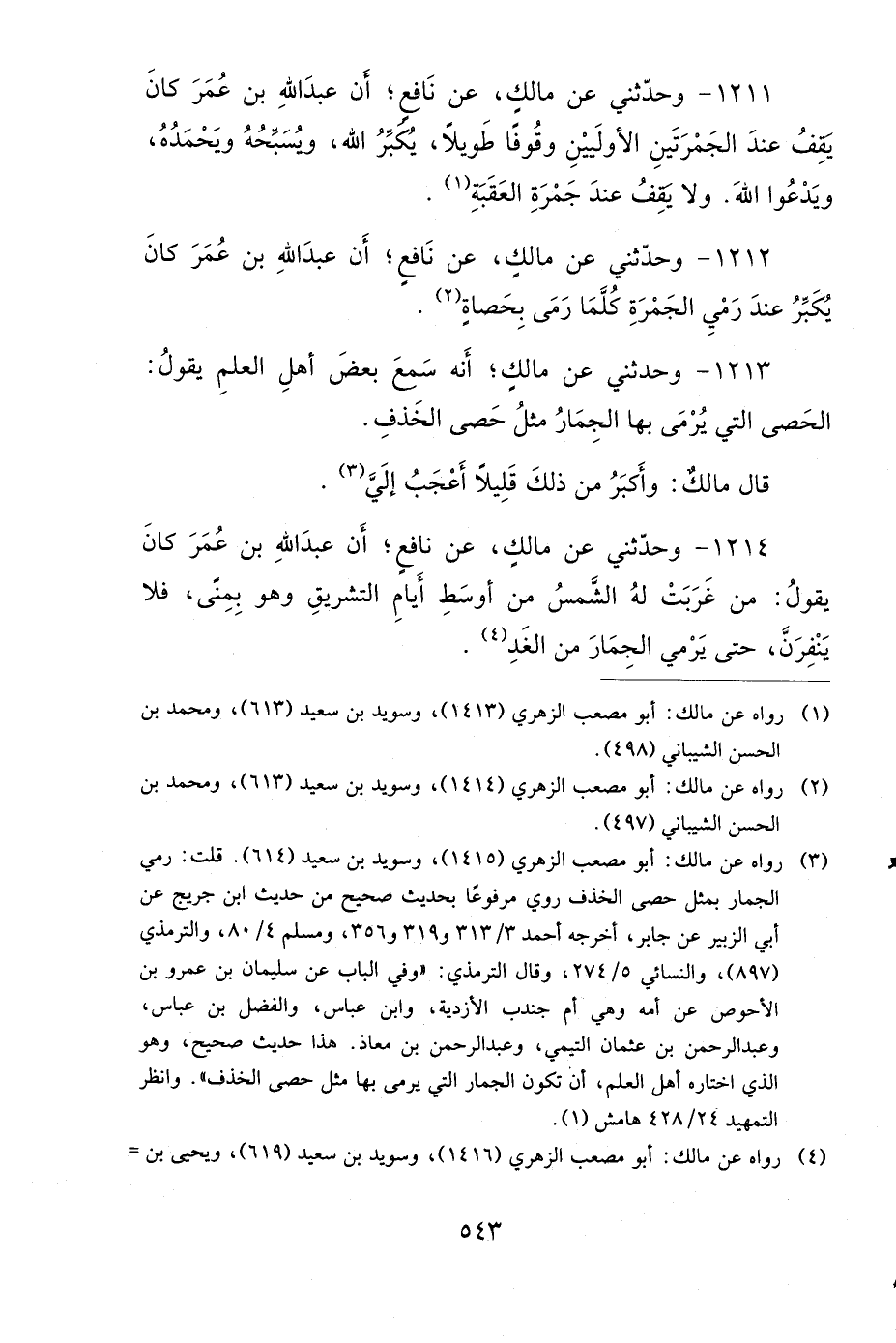 1211- وَحَدَّثَنِي عَنْ مَالِكٍ، عَنْ نَافِعٍ، أَنَّ عَبْدَ اللهِ بْنَ عُمَرَ كَانَ يَقِفُ عِنْدَ الْجَمْرَتَيْنِ الأَولَيَيْنِ وُقُوفًا طَوِيلاً، يُكَبِّرُ اللهَ، وَيُسَبِّحُهُ، وَيَحْمَدُهُ، وَيَدْعُو اللهَ، وَلاَ يَقِفُ عِنْدَ جَمْرَةِ الْعَقَبَةِ.
