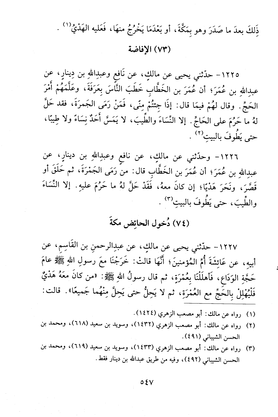 1225- حَدَّثَنِي يَحْيَى، عَنْ مَالِكٍ، عَنْ نَافِعٍ، وَعَبْدِ اللهِ بْنِ دِينَارٍ، عَنْ عَبْدِ اللهِ بْنِ عُمَرَ؛ أَنَّ عُمَرَ بْنَ الْخَطَّابِ خَطَبَ النَّاسَ بِعَرَفَةَ، وَعَلَّمَهُمْ أَمْرَ الْحَجِّ، وَقَالَ لَهُمْ فِيمَا قَالَ: إِذَا جِئْتُمْ مِنًى، فَمَنْ رَمَى الْجَمْرَةَ، فَقَدْ حَلَّ لَهُ مَا حَرُمَ عَلَى الْحَاجِّ، إِلاَّ النِّسَاءَ وَالطِّيبَ، لاَ يَمَسَّ أَحَدٌ نِسَاءً وَلاَ طِيبًا، حَتَّى يَطُوفَ بِالْبَيْتِ.