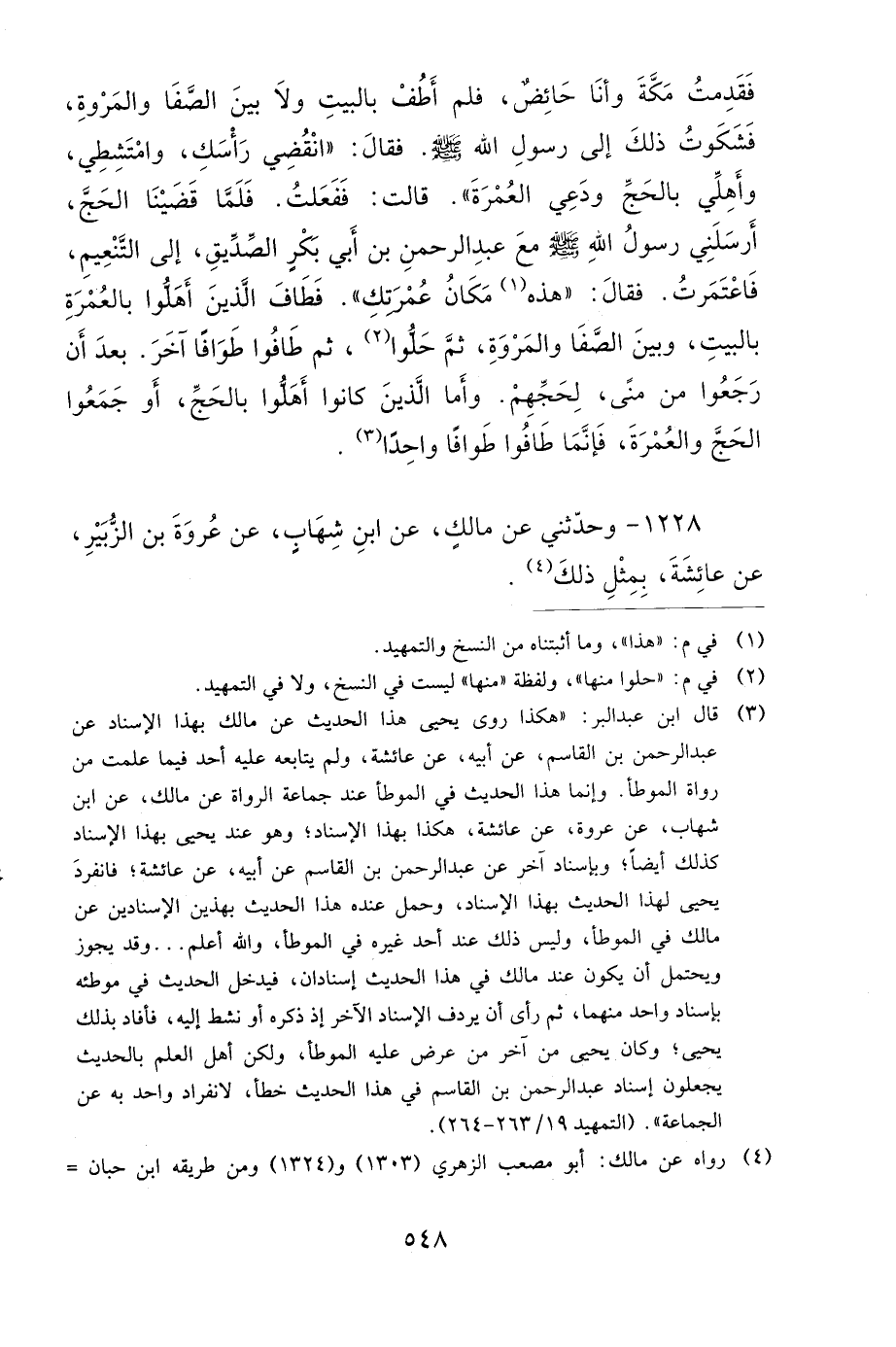 1227- حَدَّثَنِي يَحْيَى، عَنْ مَالِكٍ، عَنْ عَبْدِ الرَّحْمَنِ بْنِ الْقَاسِمِ، عَنْ أَبِيهِ، عَنْ عَائِشَةَ أُمِّ الْمُؤْمِنِينَ، أَنَّهَا قَالَتْ: خَرَجْنَا مَعَ رَسُولِ اللهِ صَلى الله عَلَيهِ وَسَلمَ عَامَ حَجَّةِ الْوَدَاعِ، فَأَهْلَلْنَا بِعُمْرَةٍ، ثُمَّ قَالَ رَسُولُ اللهِ صَلى الله عَلَيهِ وَسَلمَ: مَنْ كَانَ مَعَهُ هَدْيٌ، فَلْيُهْلِلْ بِالْحَجِّ مَعَ الْعُمْرَةِ، ثُمَّ لاَ يَحِلُّ حَتَّى يَحِلَّ مِنْهُمَا جَمِيعًا، قَالَتْ: فَقَدِمْتُ مَكَّةَ وَأَنَا حَائِضٌ، فَلَمْ أَطُفْ بِالْبَيْتِ، وَلاَ بَيْنَ الصَّفَا وَالْمَرْوَةِ، فَشَكَوْتُ ذَلِكَ إِلَى رَسُولِ اللهِ صَلى الله عَلَيهِ وَسَلمَ، فَقَالَ: انْقُضِي رَأْسَكِ وَامْتَشِطِي وَأَهِلِّي بِالْحَجِّ وَدَعِي الْعُمْرَةَ، قَالَتْ: فَفَعَلْتُ، فَلَمَّا قَضَيْنَا الْحَجَّ، أَرْسَلَنِي رَسُولُ اللهِ صَلى الله عَلَيهِ وَسَلمَ مَعَ عَبْدِ الرَّحْمَنِ بْنِ أَبِي بَكْرٍ الصِّدِّيقِ إِلَى التَّنْعِيمِ، فَاعْتَمَرْتُ، فَقَالَ: هَذَا مَكَانُ عُمْرَتِكِ، فَطَافَ الَّذِينَ أَهَلُّوا بِالْعُمْرَةِ بِالْبَيْتِ، وَبَيْنَ الصَّفَا وَالْمَرْوَةِ، ثُمَّ حَلُّوا، ثُمَّ طَافُوا طَوَافًا آخَرَ، بَعْدَ أَنْ رَجَعُوا مِنْ مِنًى لِحَجِّهِمْ، وَأَمَّا الَّذِينَ كَانُوا أَهَلُّوا بِالْحَجِّ، أَوْ جَمَعُوا الْحَجَّ وَالْعُمْرَةَ، فَإِنَّمَا طَافُوا طَوَافًا وَاحِدًا.