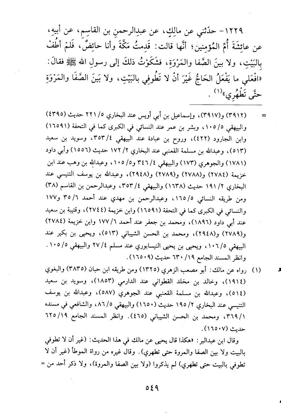 1229- حَدَّثَنِي عَنْ مَالِكٍ، عَنْ عَبْدِ الرَّحْمَنِ بْنِ الْقَاسِمِ، عَنْ أَبِيهِ، عَنْ عَائِشَةَ أُمِّ الْمُؤْمِنِينَ، أَنَّهَا قَالَتْ: قَدِمْتُ مَكَّةَ وَأَنَا حَائِضٌ، فَلَمْ أَطُفْ بِالْبَيْتِ، وَلاَ بَيْنَ الصَّفَا وَالْمَرْوَةِ، فَشَكَوْتُ ذَلِكَ إِلَى رَسُولِ اللهِ صَلى الله عَلَيهِ وَسَلمَ، فَقَالَ: افْعَلِي مَا يَفْعَلُ الْحَاجُّ، غَيْرَ أَنْ لاَ تَطُوفِي بِالْبَيْتِ، وَلاَ بَيْنَ الصَّفَا وَالْمَرْوَةِ، حَتَّى تَطْهُرِي.