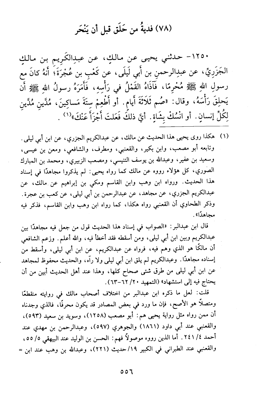 1250- حَدَّثَنِي يَحْيَى، عَنْ مَالِكٍ، عَنْ عَبْدِ الْكَرِيمِ بْنِ مَالِكٍ الْجَزَرِيِّ، عَنْ عَبْدِ الرَّحْمَنِ بْنِ أَبِي لَيْلَى، عَنْ كَعْبِ بْنِ عُجْرَةَ، أَنَّهُ كَانَ مَعَ رَسُولِ اللهِ صَلى الله عَلَيهِ وَسَلمَ مُحْرِمًا، فَآذَاهُ الْقَمْلُ فِي رَأْسِهِ، فَأَمَرَهُ رَسُولُ اللهِ صَلى الله عَلَيهِ وَسَلمَ أَنْ يَحْلِقَ رَأْسَهُ، وَقَالَ: صُمْ ثَلاَثَةَ أَيَّامٍ، أَوْ أَطْعِمْ سِتَّةَ مَسَاكِينَ، مُدَّيْنِ مُدَّيْنِ لِكُلِّ إِنْسَانٍ، أَوِ انْسُكْ بِشَاةٍ، أَيَّ ذَلِكَ فَعَلْتَ أَجْزَأَ عَنْكَ.