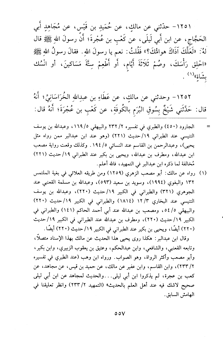 1252- وَحَدَّثَنِي عَنْ مَالِكٍ، عَنْ عَطَاءِ بْنِ عَبْدِ اللهِ الْخُرَاسَانِيِّ، أَنَّهُ قَالَ: حَدَّثَنِي شَيْخٌ بِسُوقِ الْبُرَمِ بِالْكُوفَةِ، عَنْ كَعْبِ بْنِ عُجْرَةَ، أَنَّهُ قَالَ: جَاءَنِي رَسُولُ اللهِ صَلى الله عَلَيهِ وَسَلمَ وَأَنَا أَنْفُخُ تَحْتَ قِدْرٍ لأَصْحَابِي، وَقَدِ امْتَلأَ رَأْسِي وَلِحْيَتِي قَمْلاً، فَأَخَذَ بِجَبْهَتِي، ثُمَّ قَالَ: احْلِقْ هَذَا الشَّعَرَ، وَصُمْ ثَلاَثَةَ أَيَّامٍ، أَوْ أَطْعِمْ سِتَّةَ مَسَاكِينَ، وَقَدْ كَانَ رَسُولُ اللهِ صَلى الله عَلَيهِ وَسَلمَ عَلِمَ أَنَّهُ لَيْسَ عِنْدِي مَا أَنْسُكُ بِهِ.