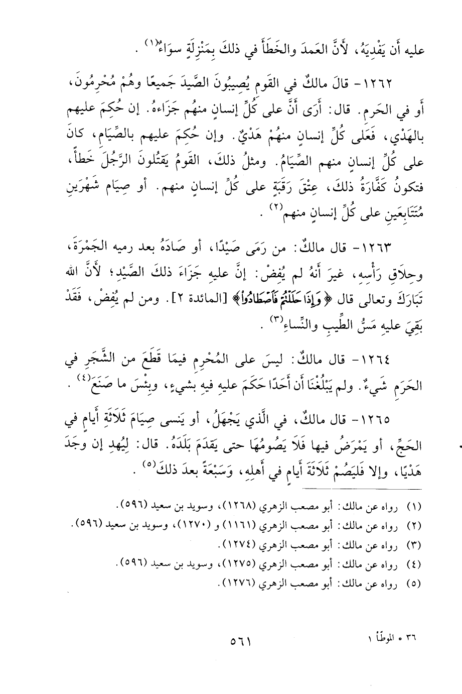 1262- قَالَ مَالِكٌ: فِي الْقَوْمِ يُصِيبُونَ الصَّيْدَ جَمِيعًا وَهُمْ مُحْرِمُونَ، أَوْ فِي الْحَرَمِ، قَالَ: أَرَى أَنَّ عَلَى كُلِّ إِنْسَانٍ مِنْهُمْ جَزَاءَهُ، إِنْ حُكِمَ عَلَيْهِمْ بِالْهَدْيِ، فَعَلَى كُلِّ إِنْسَانٍ مِنْهُمْ هَدْيٌ، وَإِنْ حُكِمَ عَلَيْهِمْ بِالصِّيَامِ، كَانَ عَلَى كُلِّ إِنْسَانٍ مِنْهُمُ الصِّيَامُ، وَمِثْلُ ذَلِكَ، الْقَوْمُ يَقْتُلُونَ الرَّجُلَ خَطَأً، فَتَكُونُ كَفَّارَةُ ذَلِكَ عِتْقَ رَقَبَةٍ عَلَى كُلِّ إِنْسَانٍ مِنْهُمْ، أَوْ صِيَامَ شَهْرَيْنِ مُتَتَابِعَيْنِ عَلَى كُلِّ إِنْسَانٍ مِنْهُمْ.