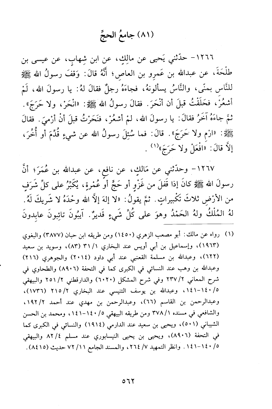 1266- حَدَّثَنِي يَحْيَى، عَنْ مَالِكٍ، عَنِ ابْنِ شِهَابٍ، عَنْ عِيسَى بْنِ طَلْحَةَ، عَنْ عَبْدِ اللهِ بْنِ عَمْرِو بْنِ الْعَاصِ، أَنَّهُ قَالَ: وَقَفَ رَسُولُ اللهِ صَلى الله عَلَيهِ وَسَلمَ لِلنَّاسِ بِمِنًى، وَالنَّاسُ يَسْأَلُونَهُ، فَجَاءَهُ رَجُلٌ فَقَالَ لَهُ: يَا رَسُولَ اللهِ، لَمْ أَشْعُرْ فَحَلَقْتُ قَبْلَ أَنْ أَنْحَرَ، فَقَالَ رَسُولُ اللهِ صَلى الله عَلَيهِ وَسَلمَ: انْحَرْ وَلاَ حَرَجَ، ثُمَّ جَاءَهُ آخَرُ فَقَالَ: يَا رَسُولَ اللهِ، لَمْ أَشْعُرْ فَنَحَرْتُ قَبْلَ أَنْ أَرْمِيَ، فَقَالَ صَلى الله عَلَيهِ وَسَلمَ: ارْمِ وَلاَ حَرَجَ، قَالَ: فَمَا سُئِلَ رَسُولُ اللهِ صَلى الله عَلَيهِ وَسَلمَ عَنْ شَيْءٍ، قُدِّمَ وَلاَ أُخِّرَ، إِلاَّ قَالَ: افْعَلْ وَلاَ حَرَجَ.