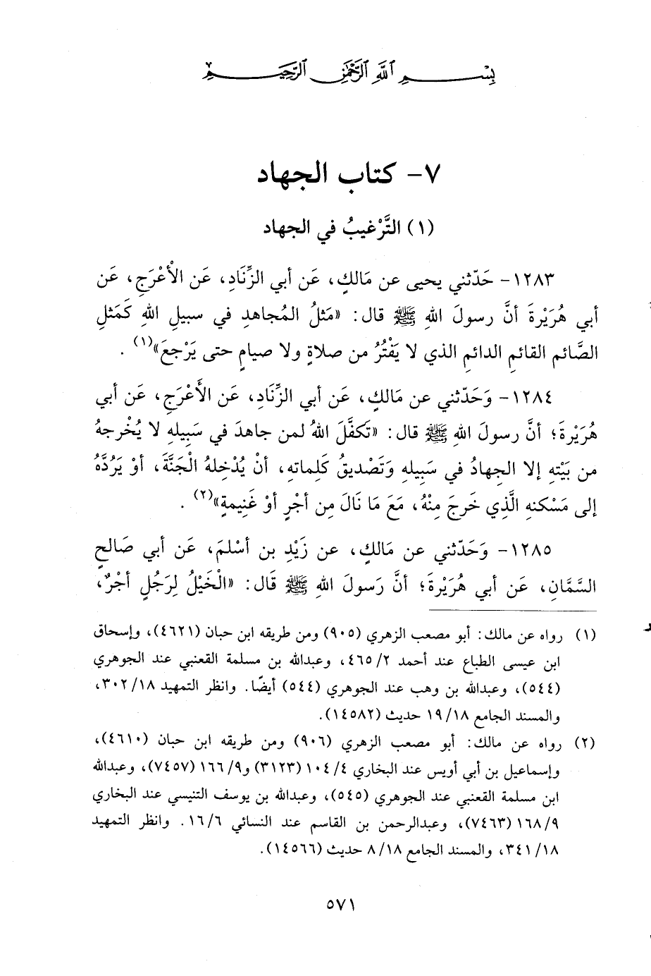 1284- وَحَدَّثَنِي عَنْ مَالِكٍ، عَنْ أَبِي الزِّنَادِ، عَنِ الأَعْرَجِ، عَنْ أَبِي هُرَيْرَةَ، أَنَّ رَسُولَ اللهِ صَلى الله عَلَيهِ وَسَلمَ قَالَ: تَكَفَّلَ اللهُ لِمَنْ جَاهَدَ فِي سَبِيلِهِ، لاَ يُخْرِجُهُ مِنْ بَيْتِهِ إِلاَّ الْجِهَادُ فِي سَبِيلِهِ، وَتَصْدِيقُ كَلِمَاتِهِ، أَنْ يُدْخِلَهُ الْجَنَّةَ، أَوْ يَرُدَّهُ إِلَى مَسْكَنِهِ الَّذِي خَرَجَ مِنْهُ، مَعَ مَا نَالَ مِنْ أَجْرٍ أَوْ غَنِيمَةٍ.