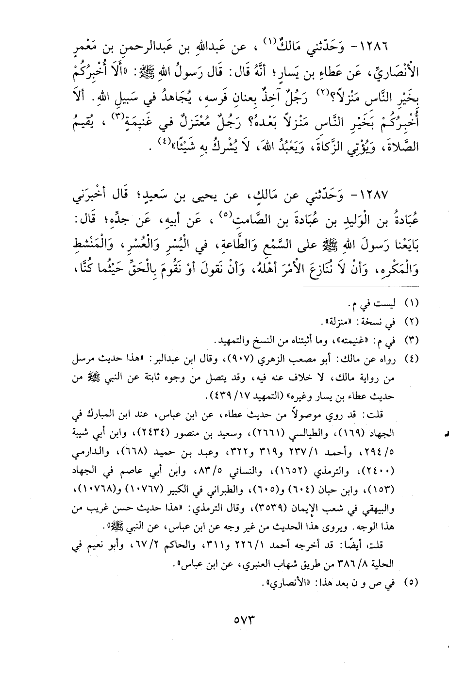 1286- وحَدَّثَنِي مَالِكٌ، عَنْ عَبْدِ اللهِ بْنِ عَبْدِ الرَّحْمَنِ بْنِ مَعْمَرٍ الأَنْصَارِيِّ، عَنْ عَطَاءِ بْنِ يَسَارٍ، أَنَّهُ قَالَ: قَالَ رَسُولُ اللهِ صَلى الله عَلَيهِ وَسَلمَ: أَلاَ أُخْبِرُكُمْ بِخَيْرِ النَّاسِ مَنْزِلاً؟ رَجُلٌ آخِذٌ بِعِنَانِ فَرَسِهِ، يُجَاهِدُ فِي سَبِيلِ اللهِ، أَلاَ أُخْبِرُكُمْ بِخَيْرِ النَّاسِ مَنْزِلاً بَعْدَهُ؟ رَجُلٌ مُعْتَزِلٌ فِي غَنِيمَةٍ، يُقِيمُ الصَّلاَةَ، وَيُؤْتِي الزَّكَاةَ، وَيَعْبُدُ اللهَ لاَ يُشْرِكُ بِهِ شَيْئًا (1).