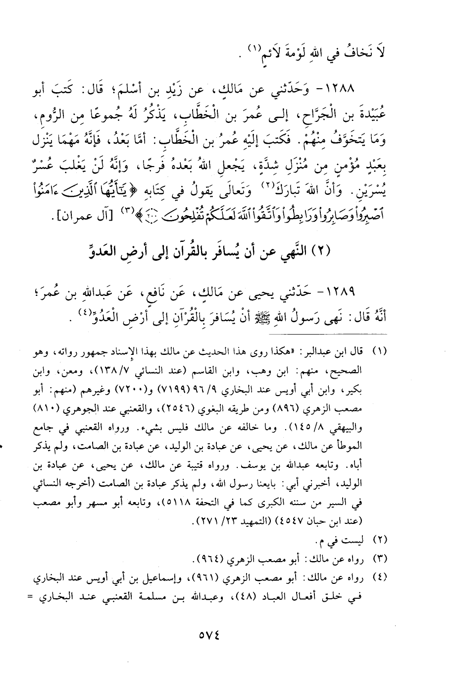 1289- حَدَّثَنِي يَحْيَى، عَنْ مَالِكٍ (1)، عَنْ نَافِعٍ، عَنْ عَبْدِ اللهِ بْنِ عُمَرَ؛ أَنَّهُ قَالَ: نَهَى رَسُولُ اللهِ صَلى الله عَلَيهِ وَسَلمَ أَنْ يُسَافَرَ بِالْقُرْآنِ إِلَى أَرْضِ الْعَدُوِّ.
