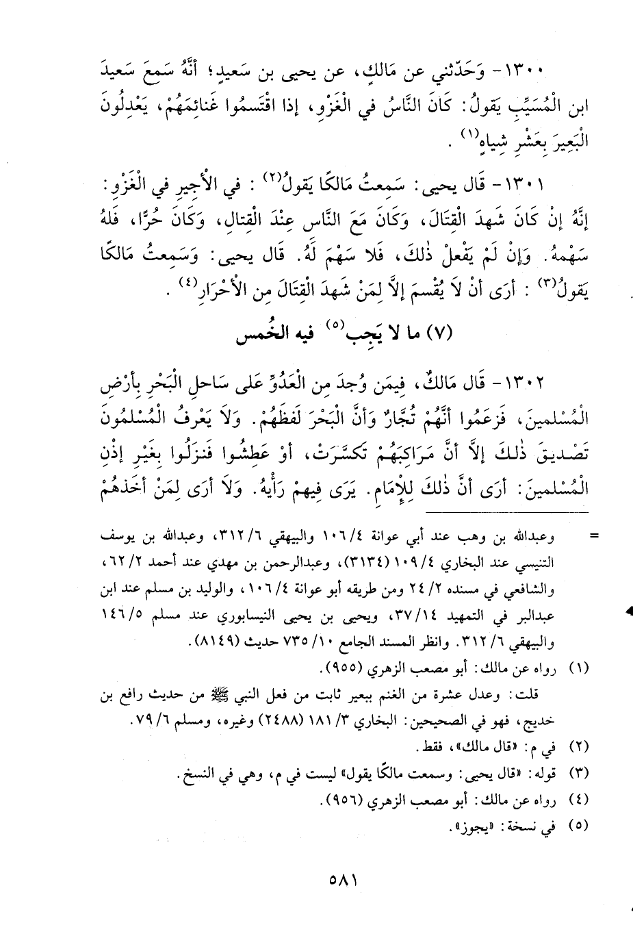 1300- وَحَدَّثَنِي عَنْ مَالِكٍ، عَنْ يَحْيَى بْنِ سَعِيدٍ، أَنَّهُ سَمِعَ سَعِيدَ بْنَ الْمُسَيَّبِ، يَقُولُ: كَانَ النَّاسُ فِي الْغَزْوِ، إِذَا اقْتَسَمُوا غَنَائِمَهُمْ، يَعْدِلُونَ الْبَعِيرَ بِعَشْرِ شِيَاهٍ.