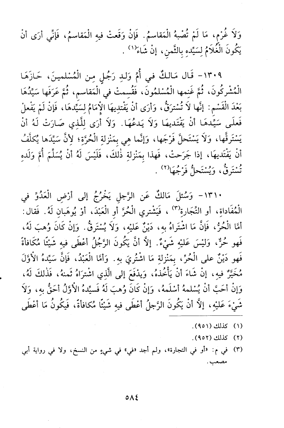1309- قَالَ مَالِكٌ: فِي أُمِّ وَلَدِ رَجُلٍ مِنَ الْمُسْلِمِينَ، حَازَهَا الْمُشْرِكُونَ، ثُمَّ غَنِمَهَا الْمُسْلِمُونَ، فَقُسِمَتْ فِي الْمَقَاسِمِ، ثُمَّ عَرَفَهَا سَيِّدُهَا بَعْدَ الْقَسْمِ: إِنَّهَا لاَ تُسْتَرَقُّ، وَأَرَى أَنْ يَفْتَدِيَهَا الإِمَامُ لِسَيِّدِهَا، فَإِنْ لَمْ يَفْعَلْ، فَعَلَى سَيِّدِهَا أَنْ يَفْتَدِيَهَا وَلاَ يَدَعُهَا، وَلاَ أَرَى لِلَّذِي صَارَتْ لَهُ أَنْ يَسْتَرِقَّهَا وَلاَ يَسْتَحِلَّ فَرْجَهَا، وَإِنَّمَا هِيَ بِمَنْزِلَةِ الْحُرَّةِ، لأَنَّ سَيِّدَهَا يُكَلَّفُ أَنْ يَفْتَدِيَهَا، إِذَا جَرَحَتْ، فَهَذَا بِمَنْزِلَةِ ذَلِكَ، فَلَيْسَ لَهُ أَنْ يُسَلِّمَ أُمَّ وَلَدِهِ تُسْتَرَقُّ وَيُسْتَحَلُّ فَرْجُهَا.