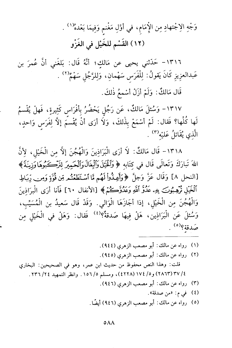 1316- حَدَّثَنِي يَحْيَى، عَنْ مَالِكٍ، أَنَّهُ قَالَ: بَلَغَنِي أَنَّ عُمَرَ بْنَ عَبْدِ الْعَزِيزِ كَانَ يَقُولُ: لِلْفَرَسِ سَهْمَانِ، وَلِلرَّجُلِ سَهْمٌ.