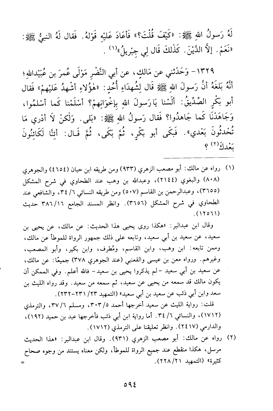 1329- وَحَدَّثَنِي عَنْ مَالِكٍ، عَنْ أَبِي النَّضْرِ، مَوْلَى عُمَرَ بْنِ عُبَيْدِ اللهِ، أَنَّهُ بَلَغَهُ، أَنَّ رَسُولَ اللهِ صَلى الله عَلَيهِ وَسَلمَ قَالَ لِشُهَدَاءِ أُحُدٍ: هَؤُلاَءِ أَشْهَدُ عَلَيْهِمْ، فَقَالَ أَبُو بَكْرٍ الصِّدِّيقُ: أَلَسْنَا يَا رَسُولَ اللهِ بِإِخْوَانِهِمْ؟ أَسْلَمْنَا كَمَا أَسْلَمُوا، وَجَاهَدْنَا كَمَا جَاهَدُوا؟ فَقَالَ رَسُولُ اللهِ صَلى الله عَلَيهِ وَسَلمَ: بَلَى، وَلَكِنْ لاَ أَدْرِي مَا تُحْدِثُونَ بَعْدِي؟ فَبَكَى أَبُو بَكْرٍ، ثُمَّ بَكَى، ثُمَّ قَالَ: أَئِنَّا لَكَائِنُونَ بَعْدَكَ.