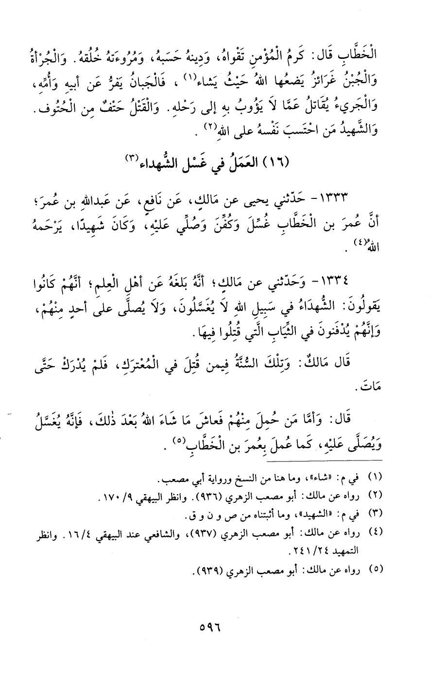 1333- حَدَّثَنِي يَحْيَى، عَنْ مَالِكٍ، عَنْ نَافِعٍ، عَنْ عَبْدِ اللهِ بْنِ عُمَرَ؛ أَنَّ عُمَرَ بْنَ الْخَطَّابِ غُسِّلَ وَكُفِّنَ وَصُلِّيَ عَلَيْهِ، وَكَانَ شَهِيدًا يَرْحَمُهُ اللهُ.