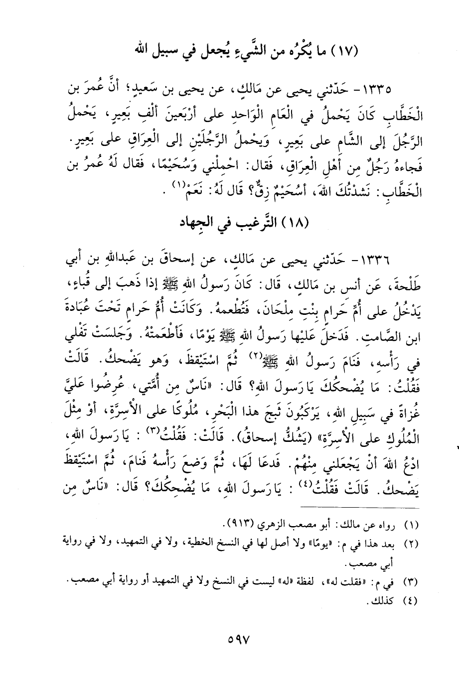 1336- حَدَّثَنِي يَحْيَى، عَنْ مَالِكٍ، عَنْ إِسْحَاقَ بْنِ عَبْدِ اللهِ بْنِ أَبِي طَلْحَةَ، عَنْ أَنَسِ بْنِ مَالِكٍ قَالَ: كَانَ رَسُولُ اللهِ صَلى الله عَلَيهِ وَسَلمَ إِذَا ذَهَبَ إِلَى قُبَاءٍ يَدْخُلُ عَلَى أُمِّ حَرَامٍ بِنْتِ مِلْحَانَ، فَتُطْعِمُهُ، وَكَانَتْ أُمُّ حَرَامٍ تَحْتَ عُبَادَةَ بْنِ الصَّامِتِ، فَدَخَلَ عَلَيْهَا رَسُولُ اللهِ صَلى الله عَلَيهِ وَسَلمَ يَوْمًا، فَأَطْعَمَتْهُ، وَجَلَسَتْ تَفْلِي فِي رَأْسِهِ، فَنَامَ رَسُولُ اللهِ صَلى الله عَلَيهِ وَسَلمَ يَوْمًا، ثُمَّ اسْتَيْقَظَ وَهُوَ يَضْحَكُ، قَالَتْ: فَقُلْتُ: مَا يُضْحِكُكَ يَا رَسُولَ اللهِ؟ قَالَ: نَاسٌ مِنْ أُمَّتِي عُرِضُوا عَلَيَّ، غُزَاةً فِي سَبِيلِ اللهِ، يَرْكَبُونَ ثَبَجَ هَذَا الْبَحْرِ، مُلُوكًا عَلَى الأَسِرَّةِ، أَوْ مِثْلَ الْمُلُوكِ عَلَى الأَسِرَّةِ، يَشُكُّ إِسْحَاقُ، قَالَتْ: فَقُلْتُ: يَا رَسُولَ اللهِ، ادْعُ اللهَ أَنْ يَجْعَلَنِي مِنْهُمْ، فَدَعَا لَهَا، ثُمَّ وَضَعَ رَأْسَهُ فَنَامَ، ثُمَّ اسْتَيْقَظَ يَضْحَكُ، قَالَتْ: فَقُلْتُ: يَا رَسُولَ اللهِ، مَا يُضْحِكُكَ؟ قَالَ: نَاسٌ مِنْ أُمَّتِي عُرِضُوا عَلَيَّ، غُزَاةً فِي سَبِيلِ اللهِ، مُلُوكًا عَلَى الأَسِرَّةِ، أَوْ مِثْلَ الْمُلُوكِ عَلَى الأَسِرَّةِ، كَمَا قَالَ فِي الأَولَى، قَالَتْ: فَقُلْتُ: يَا رَسُولَ اللهِ، ادْعُ اللهَ أَنْ يَجْعَلَنِي مِنْهُمْ، قَالَ: أَنْتِ مِنَ الأَوَّلِينَ، قَالَ: فَرَكِبَتِ الْبَحْرَ فِي زَمَنِ مُعَاوِيَةَ بْنِ أَبِي سُفْيَانَ، فَصُرِعَتْ عَنْ دَابَّتِهَا حِينَ خَرَجَتْ مِنَ الْبَحْرِ، فَهَلَكَتْ.