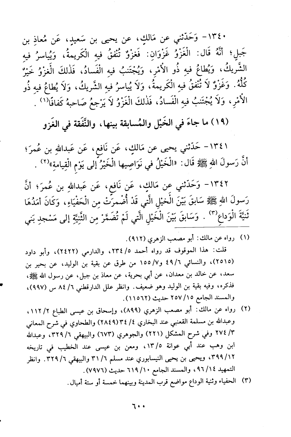 1341- حَدَّثَنِي يَحْيَى، عَنْ مَالِكٍ (1)، عَنْ نَافِعٍ، عَنْ عَبْدِ اللهِ بْنِ عُمَرَ؛ أَنَّ رَسُولَ اللهِ صَلى الله عَلَيهِ وَسَلمَ قَالَ: الْخَيْلُ فِي نَوَاصِيهَا الْخَيْرُ إِلَى يَوْمِ الْقِيَامَةِ.