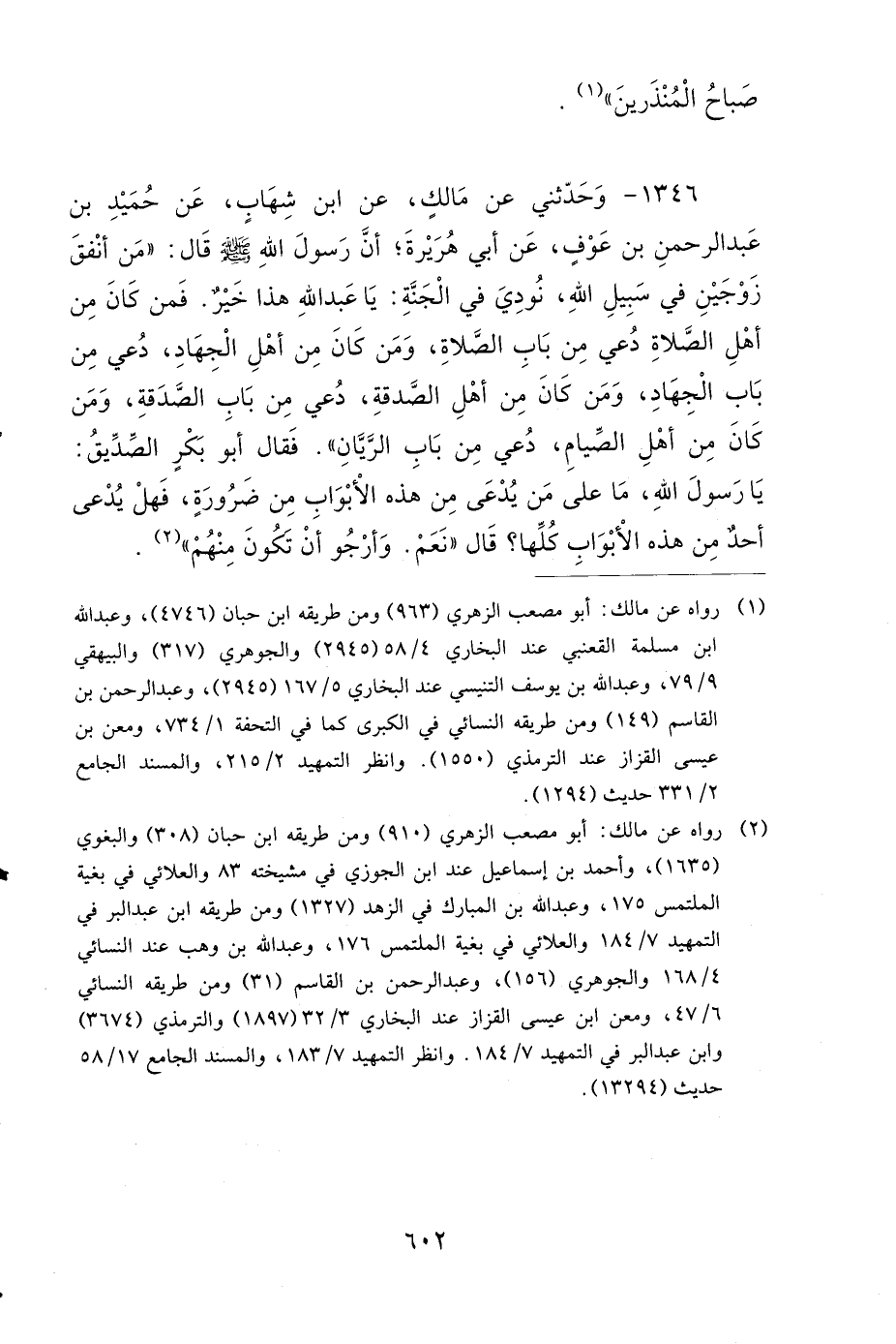 1346- وَحَدَّثَنِي عَنْ مَالِكٍ، عَنِ ابْنِ شِهَابٍ، عَنْ حُمَيْدِ بْنِ عَبْدِ الرَّحْمَنِ بْنِ عَوْفٍ، عَنْ أَبِي هُرَيْرَةَ، أَنَّ رَسُولَ اللهِ صَلى الله عَلَيهِ وَسَلمَ قَالَ: مَنْ أَنْفَقَ زَوْجَيْنِ فِي سَبِيلِ اللهِ نُودِيَ فِي الْجَنَّةِ: يَا عَبْدَ اللهِ، هَذَا خَيْرٌ، فَمَنْ كَانَ مِنْ أَهْلِ الصَّلاَةِ، دُعِيَ مِنْ بَابِ الصَّلاَةِ، وَمَنْ كَانَ مِنْ أَهْلِ الْجِهَادِ، دُعِيَ مِنْ بَابِ الْجِهَادِ، وَمَنْ كَانَ مِنْ أَهْلِ الصَّدَقَةِ، دُعِيَ مِنْ بَابِ الصَّدَقَةِ، وَمَنْ كَانَ مِنْ أَهْلِ الصِّيَامِ، دُعِيَ مِنْ بَابِ الرَّيَّانِ، فَقَالَ أَبُو بَكْرٍ الصِّدِّيقُ: يَا رَسُولَ اللهِ، مَا عَلَى مَنْ يُدْعَى مِنْ هَذِهِ الأَبْوَابِ مِنْ ضَرُورَةٍ، فَهَلْ يُدْعَى أَحَدٌ مِنْ هَذِهِ الأَبْوَابِ كُلِّهَا؟ قَالَ: نَعَمْ، وَأَرْجُو أَنْ تَكُونَ مِنْهُمْ.