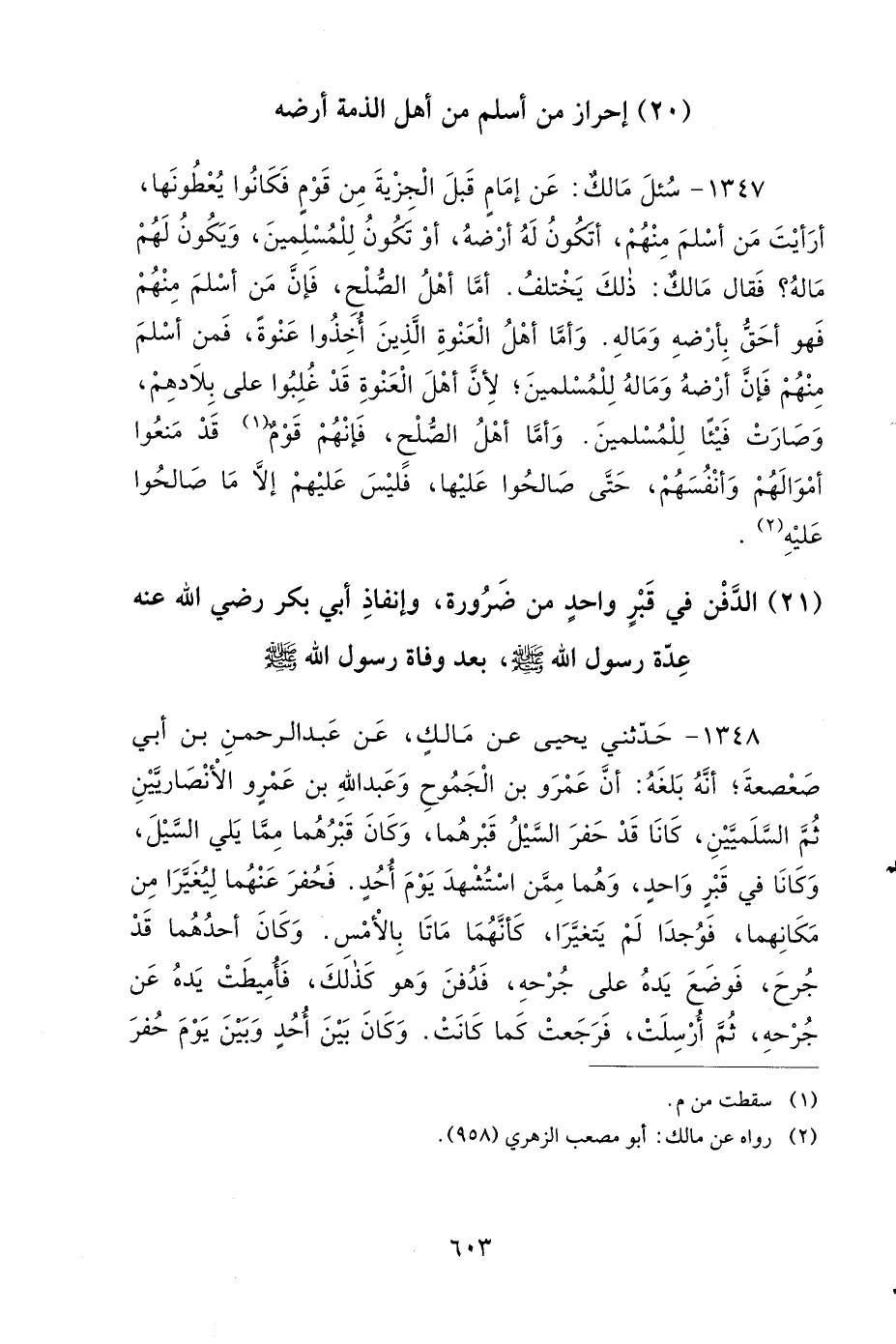 1347- سُئِلَ مَالِكٌ، عَنْ إِمَامٍ قَبِلَ الْجِزْيَةَ مِنْ قَوْمٍ فَكَانُوا يُعْطُونَهَا، أَرَأَيْتَ مَنْ أَسْلَمَ مِنْهُمْ، أَتَكُونُ لَهُ أَرْضُهُ، أَوْ تَكُونُ لِلْمُسْلِمِينَ، وَيَكُونُ لَهُمْ مَالُهُ؟ فَقَالَ مَالِكٌ: ذَلِكَ يَخْتَلِفُ، أَمَّا أَهْلُ الصُّلْحِ، فَإِنَّ مَنْ أَسْلَمَ مِنْهُمْ، فَهُوَ أَحَقُّ بِأَرْضِهِ وَمَالِهِ، وَأَمَّا أَهْلُ الْعَنْوَةِ الَّذِينَ أُخِذُوا عَنْوَةً، فَمَنْ أَسْلَمَ مِنْهُمْ، فَإِنَّ أَرْضَهُ وَمَالَهُ لِلْمُسْلِمِينَ، لأَنَّ أَهْلَ الْعَنْوَةِ قَدْ غُلِبُوا عَلَى بِلاَدِهِمْ، وَصَارَتْ فَيْئًا لِلْمُسْلِمِينَ، وَأَمَّا أَهْلُ الصُّلْحِ، فَإِنَّهُمْ قَوْمٌ قَدْ مَنَعُوا أَمْوَالَهُمْ وَأَنْفُسَهُمْ، حَتَّى صَالَحُوا عَلَيْهَا، فَلَيْسَ عَلَيْهِمْ إِلاَّ مَا صَالَحُوا عَلَيْهِ.