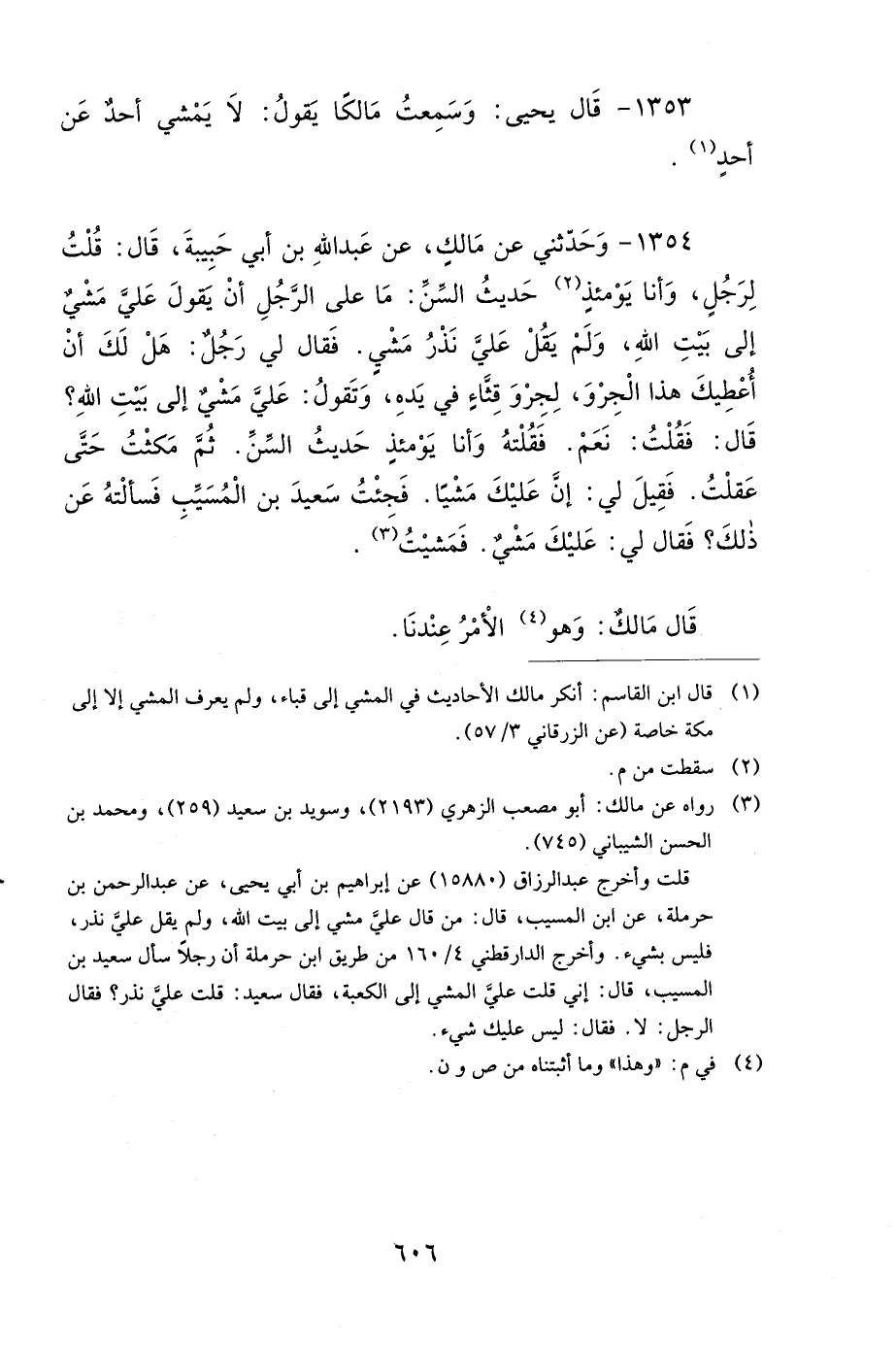 1354- وَحَدَّثَنِي عَنْ مَالِكٍ، عَنْ عَبْدِ اللهِ بْنِ أَبِي حَبِيبَةَ، قَالَ: قُلْتُ لِرَجُلٍ، وَأَنَا يَوْمَئِذٍ حَدِيثُ السِّنِّ: مَا عَلَى الرَّجُلِ أَنْ يَقُولَ عَلَيَّ مَشْيٌ إِلَى بَيْتِ اللهِ، وَلَمْ يَقُلْ عَلَيَّ نَذْرُ مَشْيٍ، فَقَالَ لِي رَجُلٌ: هَلْ لَكَ أَنْ أُعْطِيَكَ هَذَا الْجِرْوَ، لِجِرْوِ قِثَّاءٍ فِي يَدِهِ، وَتَقُولُ: عَلَيَّ مَشْيٌ إِلَى بَيْتِ اللهِ؟ قَالَ: فَقُلْتُ: نَعَمْ، فَقُلْتُهُ، وَأَنَا يَوْمَئِذٍ حَدِيثُ السِّنِّ، ثُمَّ مَكَثْتُ حَتَّى عَقَلْتُ، فَقِيلَ لِي: إِنَّ عَلَيْكَ مَشْيًا، فَجِئْتُ سَعِيدَ بْنَ الْمُسَيَّبِ، فَسَأَلْتُهُ عَنْ ذَلِكَ؟ فَقَالَ لِي: عَلَيْكَ مَشْيٌ، فَمَشَيْتُ.