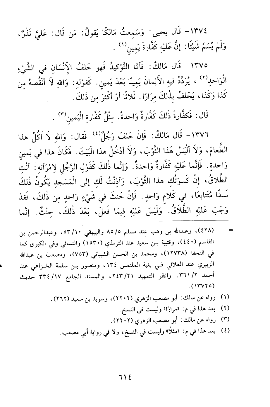 1375- قَالَ مَالِكٌ: فَأَمَّا التَّوْكِيدُ، فَهُوَ حَلِفُ الإِنْسَانِ فِي الشَّيْءِ الْوَاحِدِ، يُرَدِّدُ فِيهِ الأَيْمَانَ يَمِينًا بَعْدَ يَمِينٍ، كَقَوْلِهِ: وَاللَّهِ لاَ أَنْقُصُهُ مِنْ كَذَا وَكَذَا، يَحْلِفُ بِذَلِكَ مِرَارًا، ثَلاَثًا أَوْ أَكْثَرَ مِنْ ذَلِكَ.