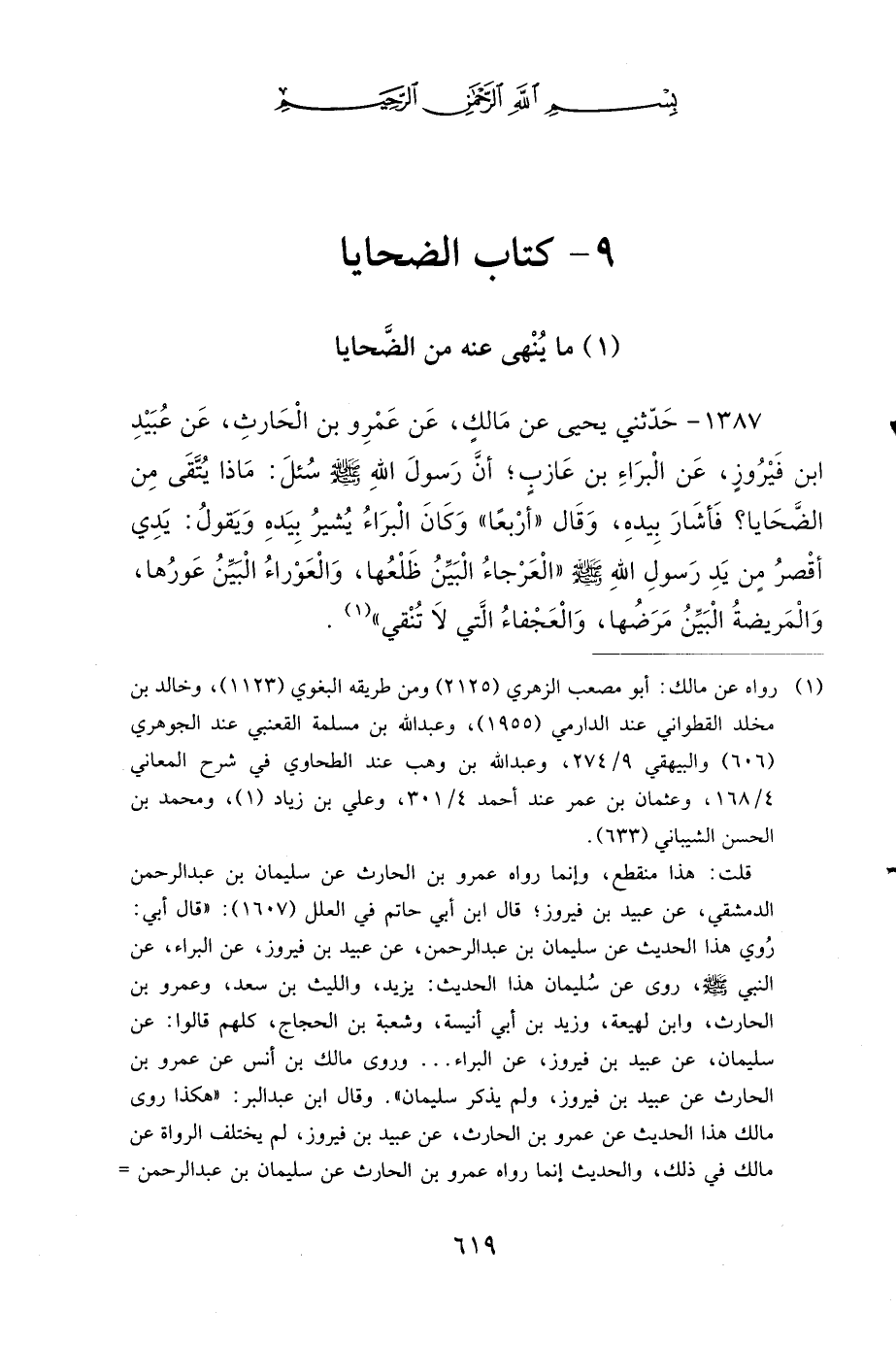 1387 - حَدَّثَنِي يَحْيَى، عَنْ مَالِكٍ، عَنْ عَمْرِو بْنِ الْحَارِثِ، عَنْ عُبَيْدِ بْنِ فَيْرُوزٍ، عَنِ الْبَرَاءِ بْنِ عَازِبٍ، أَنَّ رَسُولَ اللهِ صَلى الله عَلَيهِ وَسَلمَ سُئِلَ: مَاذَا يُتَّقَى مِنَ الضَّحَايَا؟ فَأَشَارَ بِيَدِهِ، وَقَالَ: أَرْبَعًا، وَكَانَ الْبَرَاءُ يُشِيرُ بِيَدِهِ، وَيَقُولُ: يَدِي أَقْصَرُ مِنْ يَدِ رَسُولِ اللهِ صَلى الله عَلَيهِ وَسَلمَ: الْعَرْجَاءُ الْبَيِّنُ ظَلْعُهَا، وَالْعَوْرَاءُ الْبَيِّنُ عَوَرُهَا، وَالْمَرِيضَةُ الْبَيِّنُ مَرَضُهَا، وَالْعَجْفَاءُ الَّتِي لاَ تُنْقِي.