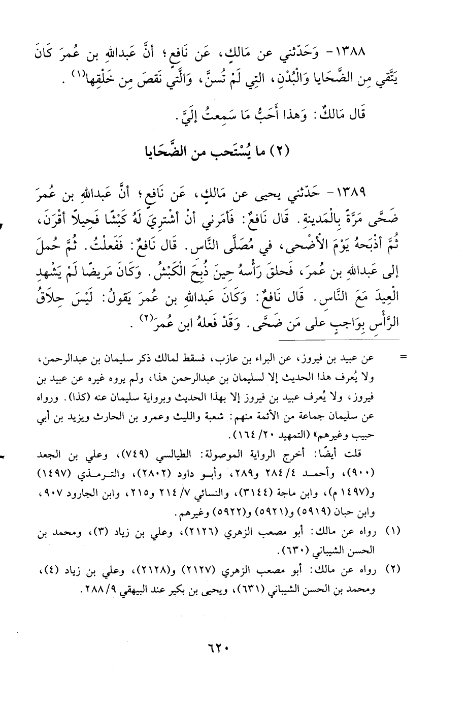 1389- حَدَّثَنِي يَحْيَى، عَنْ مَالِكٍ، عَنْ نَافِعٍ، أَنَّ عَبْدَ اللهِ بْنَ عُمَرَ ضَحَّى مَرَّةً بِالْمَدِينَةِ، قَالَ نَافِعٌ: فَأَمَرَنِي أَنْ أَشْتَرِيَ لَهُ كَبْشًا فَحِيلاً أَقْرَنَ، ثُمَّ أَذْبَحَهُ يَوْمَ الأَضْحَى فِي مُصَلَّى النَّاسِ، قَالَ نَافِعٌ: فَفَعَلْتُ، ثُمَّ حُمِلَ إِلَى عَبْدِ اللهِ بْنِ عُمَرَ، فَحَلَقَ رَأْسَهُ حِينَ ذُبِحَ الْكَبْشُ، وَكَانَ مَرِيضًا لَمْ يَشْهَدِ الْعِيدَ مَعَ النَّاسِ، قَالَ نَافِعٌ: وَكَانَ عَبْدُ اللهِ بْنُ عُمَرَ يَقُولُ: لَيْسَ حِلاَقُ الرَّأْسِ بِوَاجِبٍ عَلَى مَنْ ضَحَّى، وَقَدْ فَعَلَهُ ابْنُ عُمَرَ.