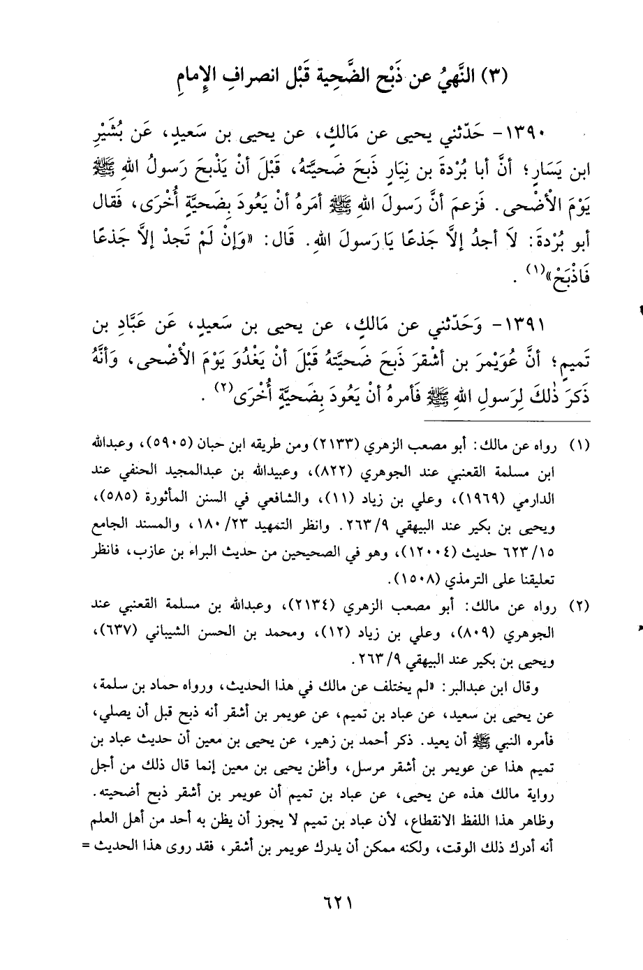 1390- حَدَّثَنِي يحْيَى، عَنْ مَالِكٍ، عَنْ يحْيَى بْنِ سَعِيدٍ، عَنْ بُشَيْرِ بْنِ يَسَارٍ، أَنَّ أَبَا بُرْدَةَ بْنَ نِيَارٍ ذَبَحَ ضَحِيَّتَهُ قَبْلَ أَنْ يَذْبَحَ رَسُولُ اللهِ صَلى الله عَلَيهِ وَسَلمَ يَوْمَ الأَضْحَى، فَزَعَمَ أَنَّ رَسُولَ اللهِ صَلى الله عَلَيهِ وَسَلمَ أَمَرَهُ أَنْ يَعُودَ بِضَحِيَّةٍ أُخْرَى، فَقَالَ أَبُو بُرْدَةَ: لاَ أَجِدُ إِلاَّ جَذَعًا يَا رَسُولَ اللهِ، قَالَ: وَإِنْ لَمْ تَجِدْ إِلاَّ جَذَعًا، فَاذْبَحْ.