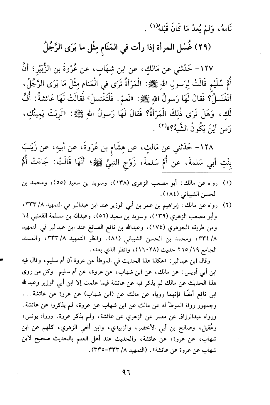 127 - حَدَّثَنِي عَنْ مَالِكٍ، عَنِ ابْنِ شِهابٍ، عَنْ عُرْوَةَ بْنِ الزُّبَيْرِ، أَنَّ أُمَّ سُلَيْمٍ قَالَتْ لِرَسُولِ اللهِ صَلى الله عَلَيهِ وَسَلمَ: الْمَرْأَةُ تَرَى فِي الْمَنَامِ مِثْلَ مَا يَرَى الرَّجُلُ، أَتَغْتَسِلُ؟ فَقَالَ لَهَا رَسُولُ اللهِ صَلى الله عَلَيهِ وَسَلمَ: نَعَمْ، فَلْتَغْتَسِلْ، فَقَالَتْ لَهَا عَائِشَةُ: أُفٍّ لَكِ , وَهَلْ تَرَى ذَلِكَ الْمَرْأَةُ؟ فَقَالَ لَهَا رَسُولُ اللهِ صَلى الله عَلَيهِ وَسَلمَ: تَرِبَتْ يَمِينُكِ، وَمِنْ أَيْنَ يَكُونُ الشَّبَهُ؟.