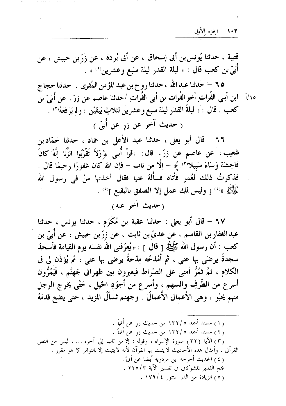 66 - قال أبو يعلى، حدثنا عبد الأعلى بن حماد، حدثنا حماد بن شعيب، عن عاصم عن زر. قال: (قرأ أُبي {وَلاَ تَقْرَبُوا الزِّنَى إِنَّهُ كَانَ فَاحِشَةً وَسَاءَ سَبِيلاَ (¬2) } - إلا من تاب - فإن الله كان غفوراً رحيماً قال: فذكرتُ ذلك لعُمر فأتاه فسألهُ عنها فقال أخذتها منْ في رسول الله - صلى الله عليه وسلم -) (¬3) [وليس لك عمل إلا الصفق بالبقيع] (¬4) .