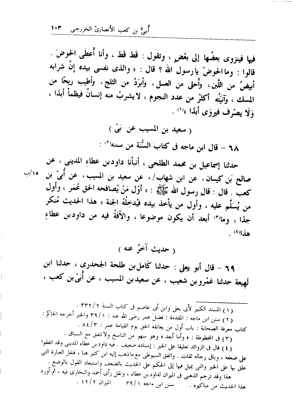 69 - قال أبو يعلى: حدثنا كامل بن طلحة الجحدري، حدثنا ابن لهيعة حدثنا عمرو بن شعيب، عن سعيد بن المسيب، عن أُبَيّ بن كعب،