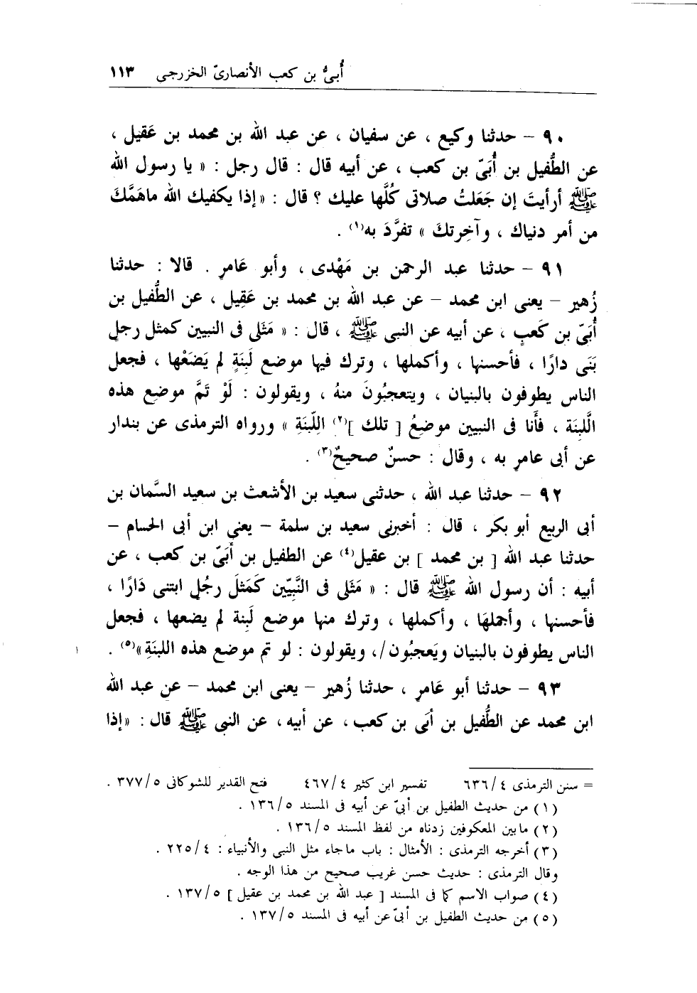 91 - حدثنا عبد الرحمن بن مهدي، وأبو عامر. قالا: حدثنا زُهير - يعني ابن محمد - عن عبد الله بن محمد بن عقيل، عن الطُّفيل بن أبي بن كعبٍ، عن أبيه عن النبي - صلى الله عليه وسلم -، قال: (مَثَلي في النبيين كمثل رجلٍ بنى داراً، فأحسنها، وأكملها، وترك فيها موضع لَبنَةٍ لم يضعها، فجعل الناس يطوفون بالبنيان، ويتعجبُون منهُ، ويقولون: لو تمَّ موضعِ هذه اللبنة، فأنا في النبيين موضعُ [تلك] (¬2) اللبنةِ (ورواه الترمذي عن بندار عن أبي عامرٍ به، وقال: حسنٌ صحيحٌ (¬3) .