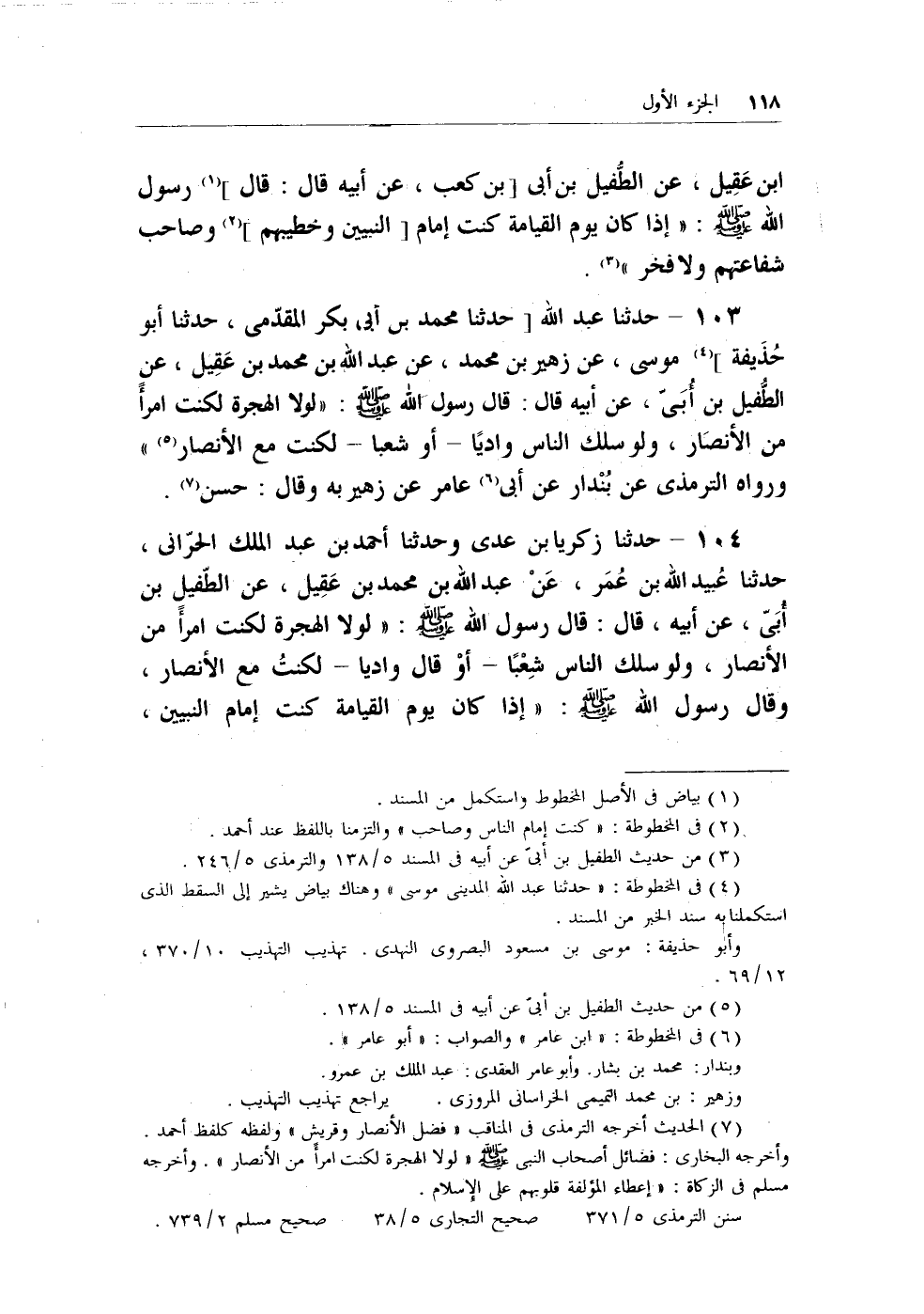 104 - حدثنا زكريا بن عدي وحدثنا أحمد بن عبد الملك الحرّاني، حدثنا عُبيد الله بن عمر، عن عبد الله بن محمد بن عَقِيل، عن الطفيل بن أُبي، عن أبيه، قال: قال رسول الله - صلى الله عليه وسلم -: (لولا الهجرة لكنت امرأً من الأنصار، ولو سلك الناس شِعْبًا - أوْ قال واديا - لكنتُ من الأنصار، وقال رسول الله - صلى الله عليه وسلم -: (إذا كان يوم القيامة كنت إمام النبيين،