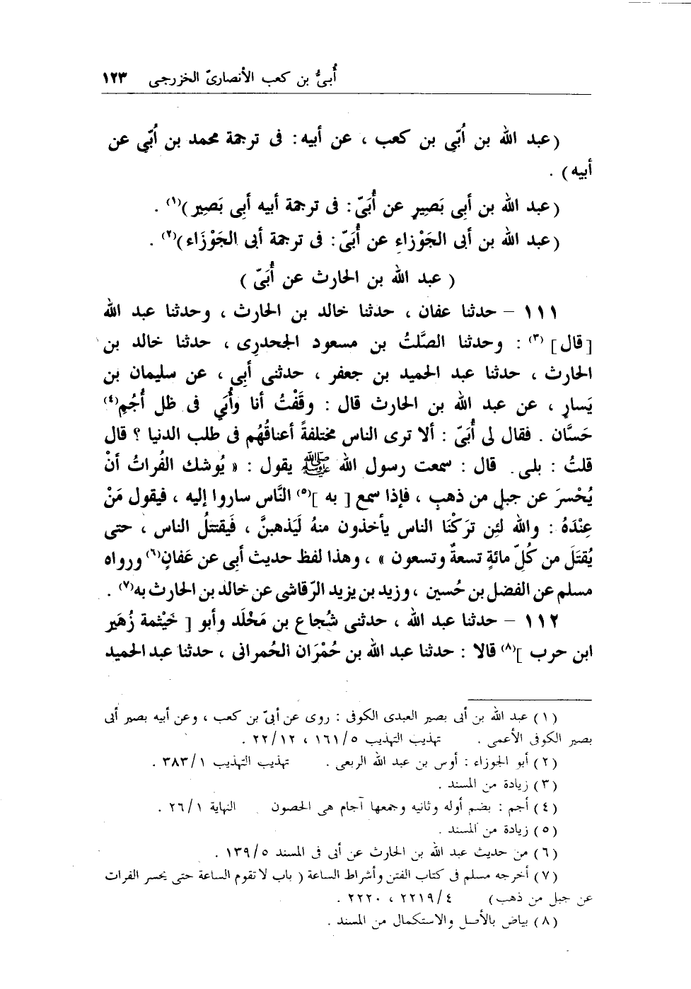 وحدثنا الصَّلتُ بن مسعود الجحدري، حدثنا خالد بن الحارث، حدثنا عبد الحميد ابن جعفر، حدثني أبي، عن سليمان بن يَسار، عن عبد الله بن الحارث قال: وقفتُ أنا ,اُبي في ظل أُجُمِ (¬2) حسَّان. فقال لي أُبَي: ألا ترى الناس مختلفة أعناقُهُم في طلب الدنيا؟ قال قلتُ: بلى. قال: سمعت رسول الله - صلى الله عليه وسلم - يقول: (يوشك الفُراتُ أنْ يُحْسرَ عن جبلٍ من ذهبٍ، فإذا سمع [به] (¬3) الناس ساروا إليه، فيقول مَنْ عِنْدَهُ: والله لئن تركنا الناس يأخذون منه ليذهبنَّ، فيقتتلُ الناس، حتى يُقتل من كُلِّ مائةٍ تسعةٌ وتسعون) ، وهذا لفظ حديث أبِي عن عفانٍ (¬4) ورواه مسلم عن الفضل بن حُسين، وزيد بن يزيد الرّقاشي عن خالد بن الحارث به (¬5) .
