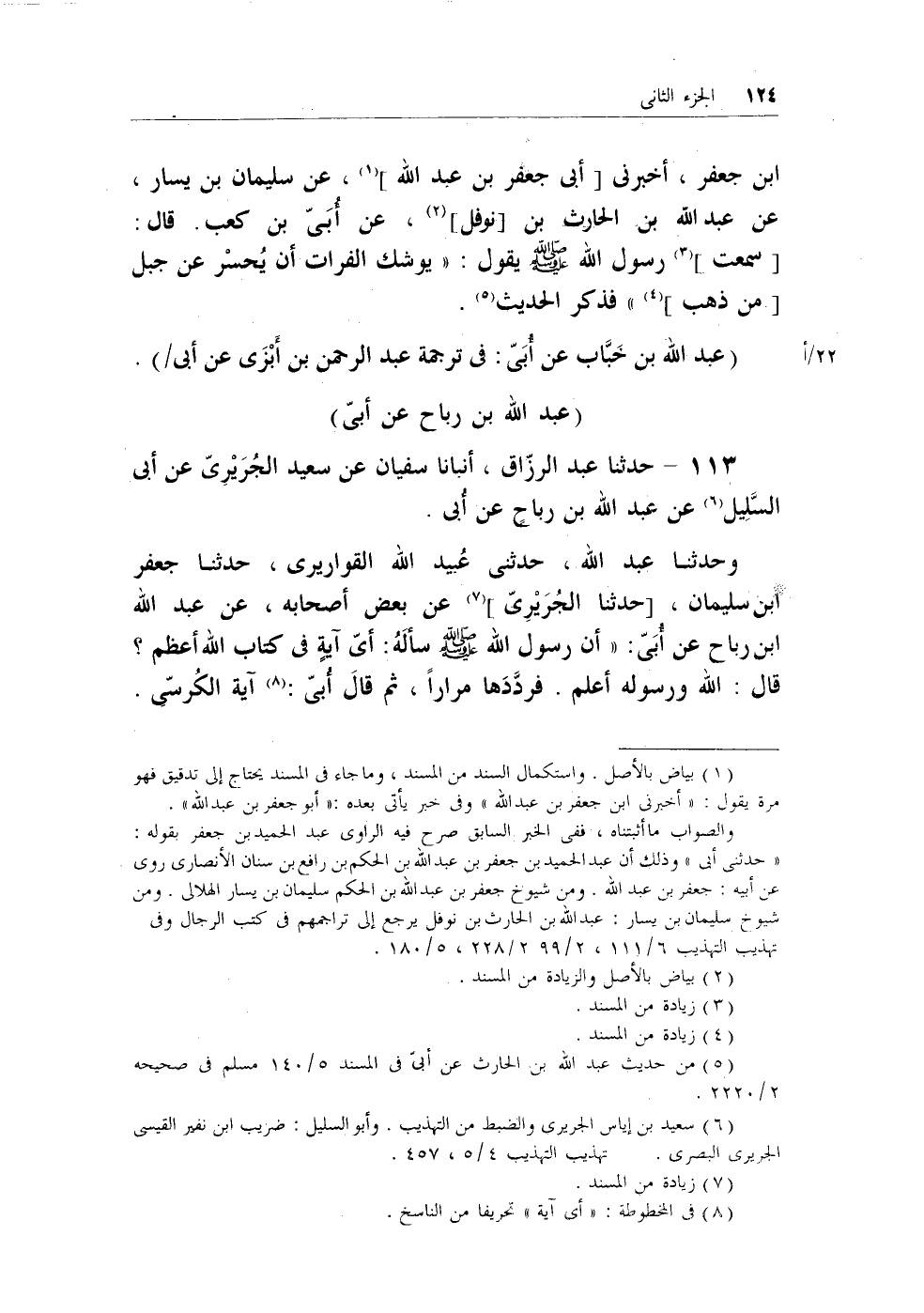 وحدثنا عبد الله، حدثني عُبيد الله القواريري، حدثنا جعفر بن سليمان، [حدثنا الجُرَيْرِىّ] (¬2) عن بعض أصحابه، عن عبد الله بن رباح عن أُبَيّ: (أن رسول الله - صلى الله عليه وسلم - سألهُ: أيّ آيةٍ في كتاب الله أعظم؟ قال: الله ورسوله أعلم. فردَّدَها مراراً، ثم قالَ أُبَي: (¬3) آية الكُرسي.