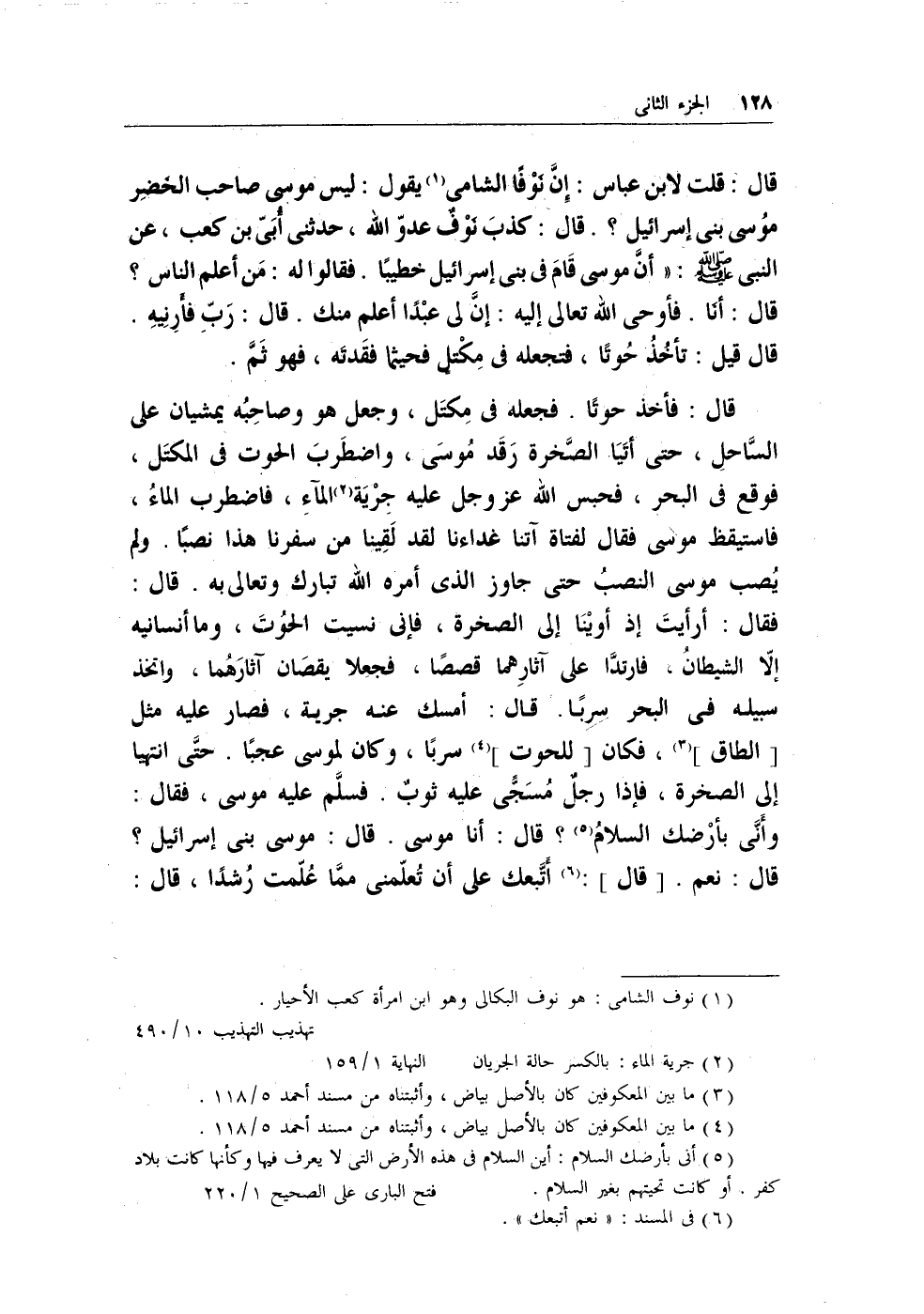 قال: قلت لابن عباس: إن نَوْفاً الشامي (¬1) يقول: ليس موسى صاحب الخضِر مُوسى بني إسرائيل؟. قال: كذب نوفٌ عدو الله، حدثني أُبيَ بن كعب، عن النبي - صلى الله عليه وسلم -: (أن موسى قام في بني إسرائيل خطيباً. فقالوا له: من أعلم الناس؟ قال: أنا. فأوحى الله تعالى إليه: إن لي عبداً أعلم منك. قال: رب فأرنيه. قال قيل: تأخُذُ حُوتاً، فتجعله في مكتلٍ فحيثما فقدته، فهو ثَمَّ.