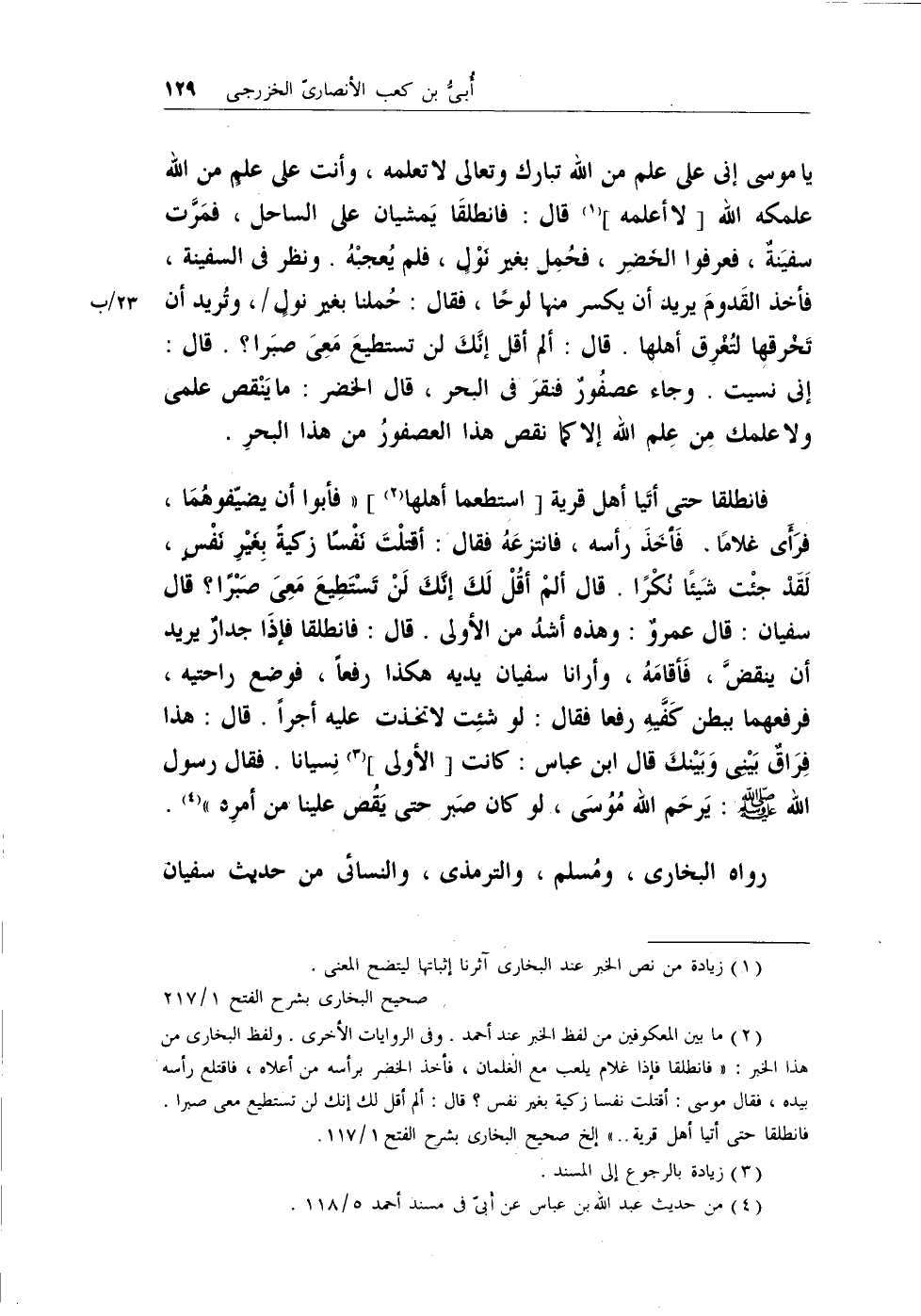 (¬2) مابين المعكوفين من لفظ الخبر عند أحمد. وفي الروايات الأخرى. ولفظ البخاري من هذا الخبر: (فانطلقا فإذا غلام يلعب مع الغلمان، فأخذ الخضر برأسه من أعلاه، فاقتلع رأسه بيده، فقال موسى: أقتلت نفسياً زكية بغير نفس؟ قال: ألم أقل لك إنك لن تستطيع معي صبراً فانطلقنا حتى أتيا أهل قرية ... ) إلخ صحيح البخاري بشرح الفتح 1/117.