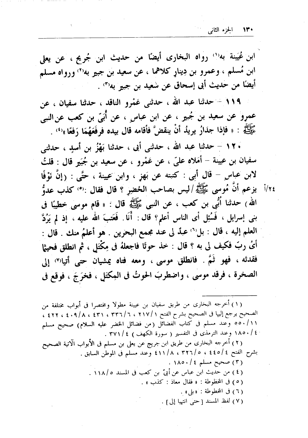 (¬1) أخرجه البخاري من طريق سفيان بن عيينة مطولاً ومختصراً في أبواب مختلفة من الصحيح يرجع إليها في الصحيح بشرح الفتح 1/217، 6/336، 431، 8/409، 422، 11/550 وعند مسلم في كتاب الفضائل (من فضائل الخضر عليه السلام) صحيح مسلم 4/1850 وعند الترمذي في التفسير (سورة الكهف) 4/371.