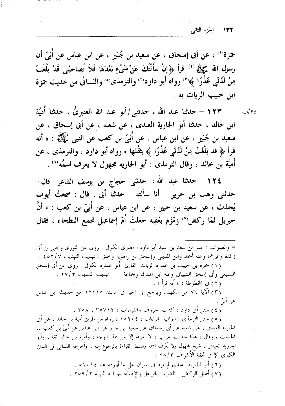 حمزة (¬1) ، عن أبي إسحاق، عن سعيد بن جُبير، عن ابن عباس عن أُبي أن رسول الله - صلى الله عليه وسلم - (¬2) قرأ {قَالَ إِنْ سَأَلْتُكَ عَنْ شَيْءٍ بَعْدَهَا فَلا تُصَاحِبْنِي قَالَ إِنْ سَأَلْتُكَ عَنْ شَيْءٍ بَعْدَهَا فَلَا تُصَاحِبْنِي قَدْ بَلَغْتَ مِنْ لَدُنِّي عُذْرًا} (¬3) رواه أبو داود (¬4) والترمذي (¬5) والنسائي من حديث حمزة بن حبيب الزيات به.
